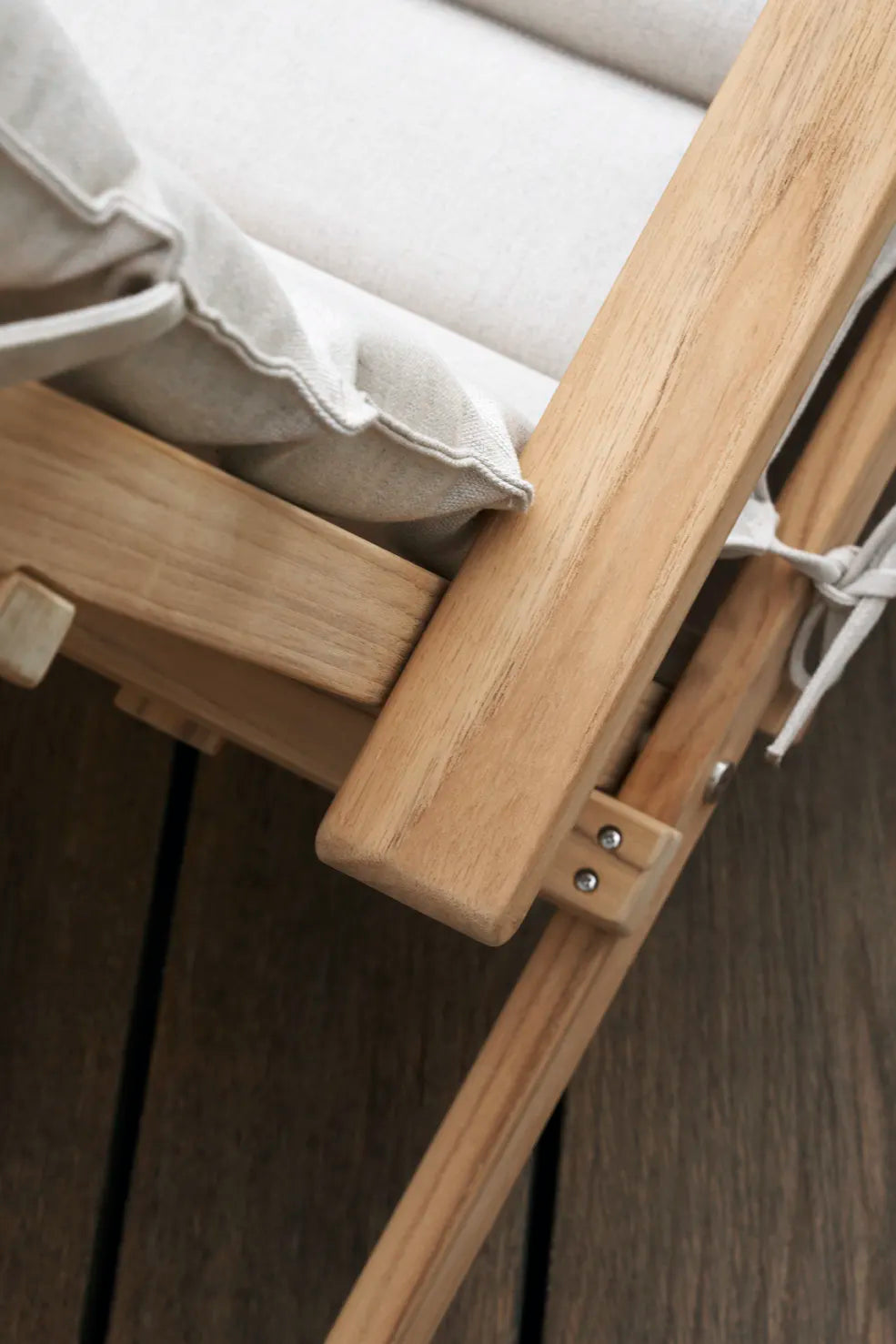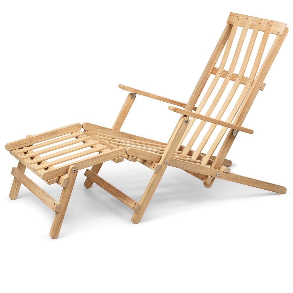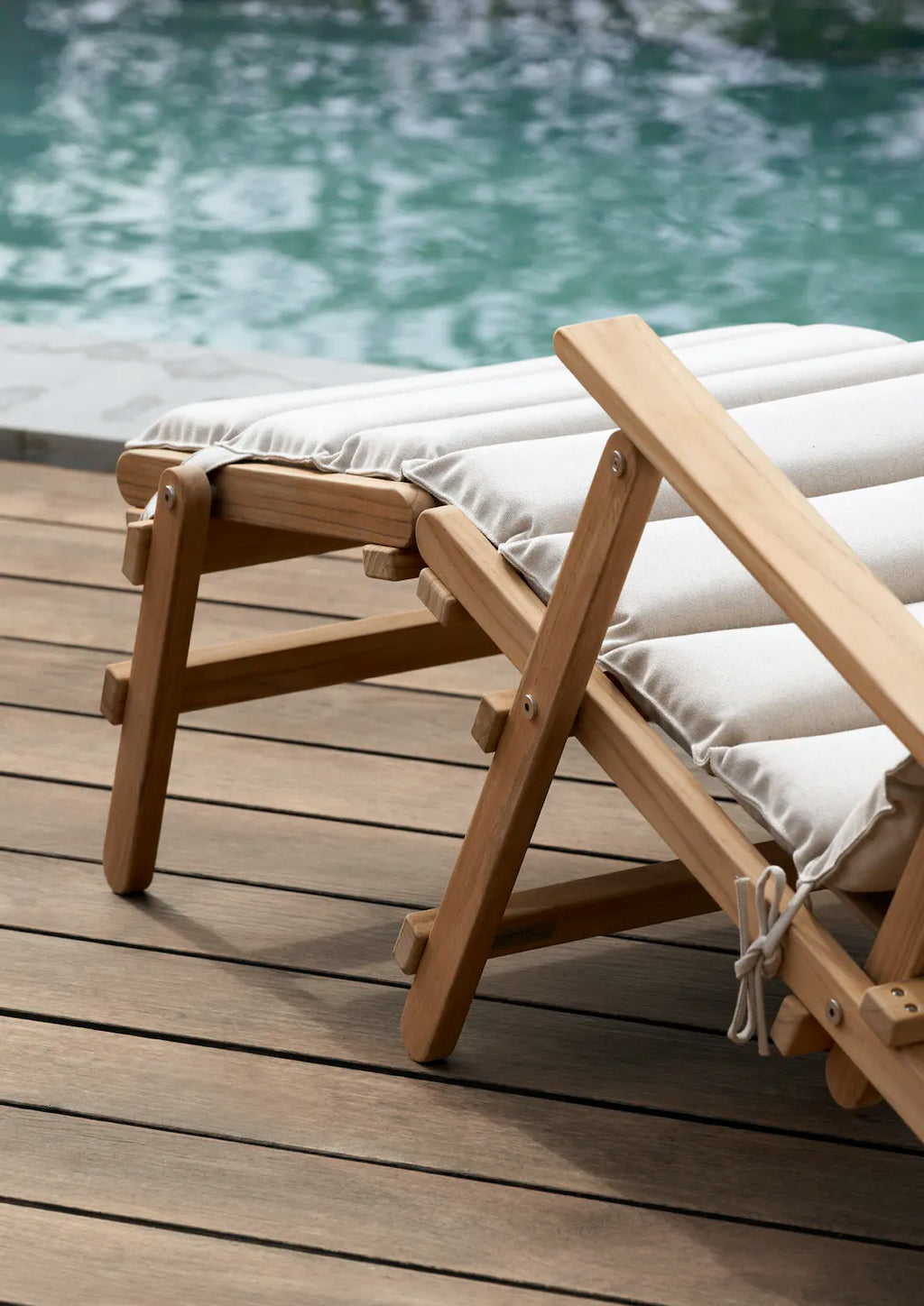 Made for maximum durability from hard and strong teak wood, left untreated to patina beautifully over time, the reclining wooden frame of the BM55565 Deck Chair with Footrest gives the chair a welcoming and honest look. Perfectly befitting a relaxing outdoor environment, the wooden slats follow the natural curvature of the body to provide optimal comfort as well as a light and elegant expression.