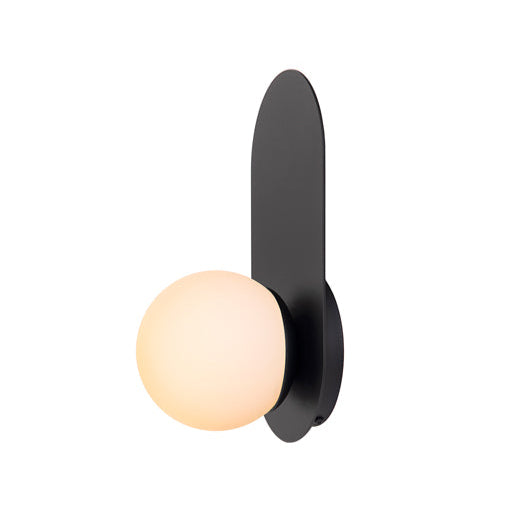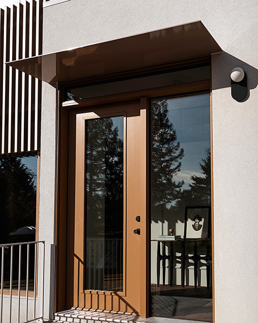 The Arch wall sconce offers a minimalist design that blends seamlessly into various exteriors and its opal frosted glass globe emits a soft, diffused light, creating a warm ambiance.