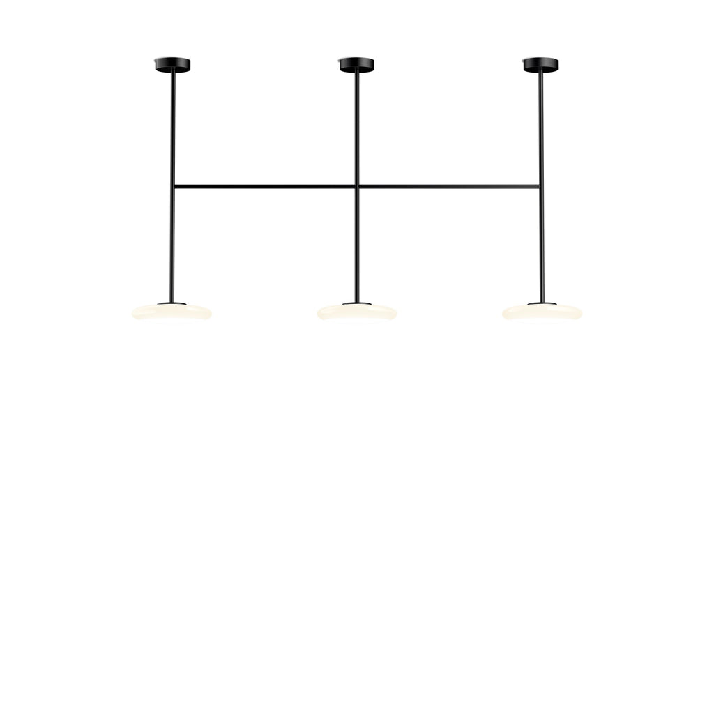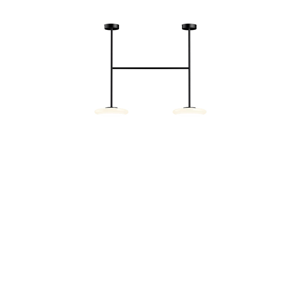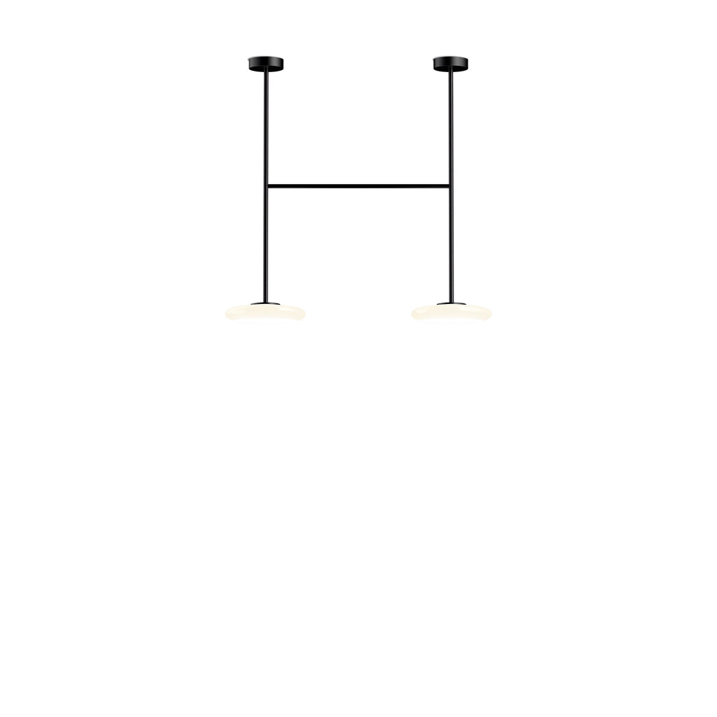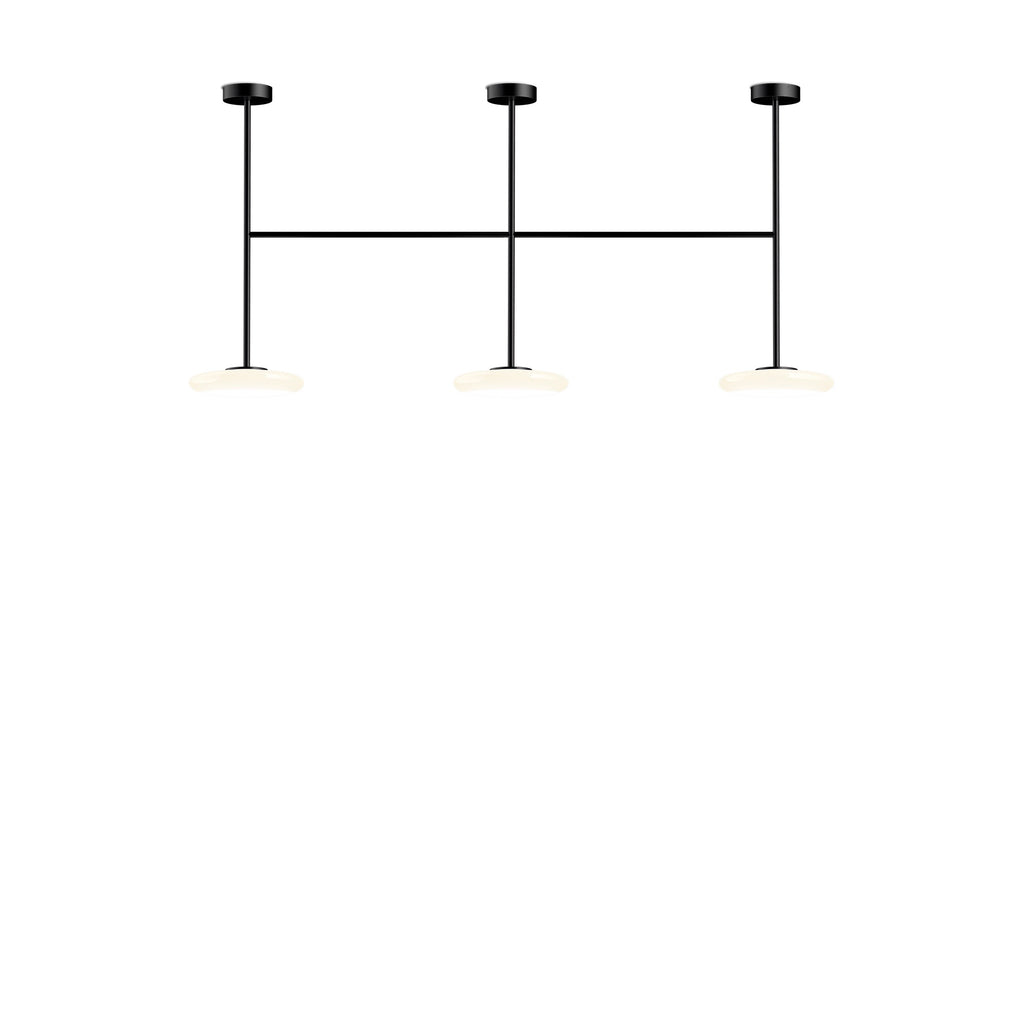 The serene shapes of the Ihana trace out a silhouette of light. This lighting system consists of several opal blown glass diffusers that are pleasing to the eye, appear ductile and contrast with the firmness of the metal structure that determines its shape and fastens it to the ceiling.