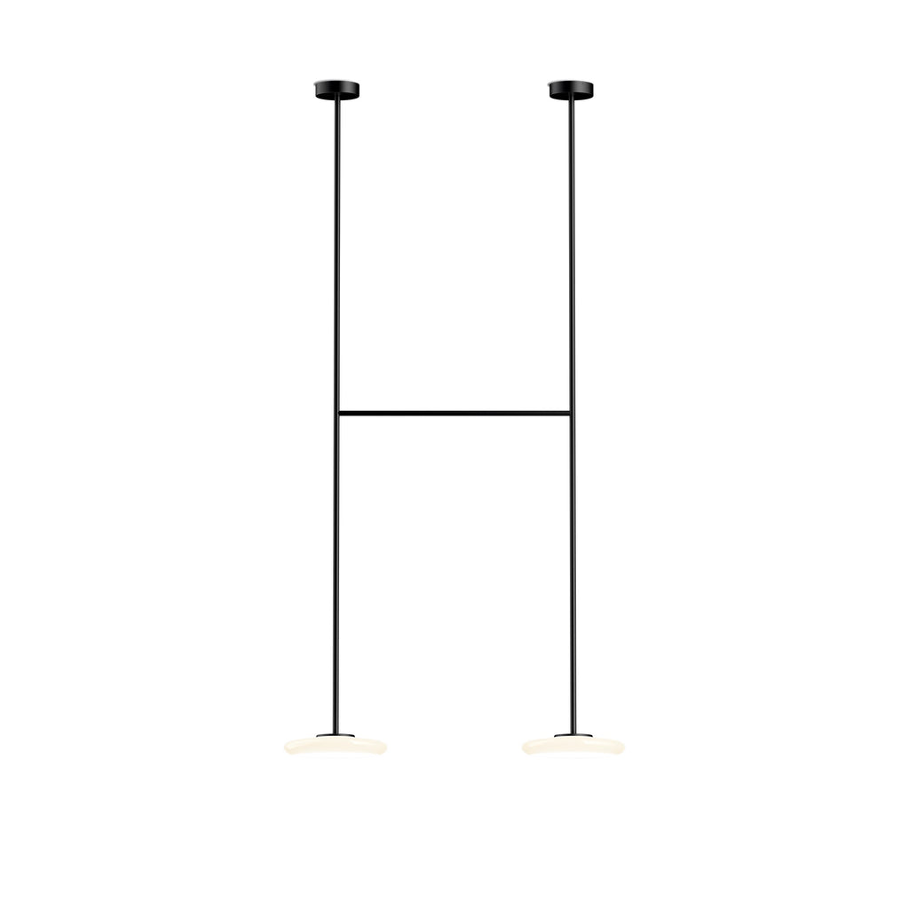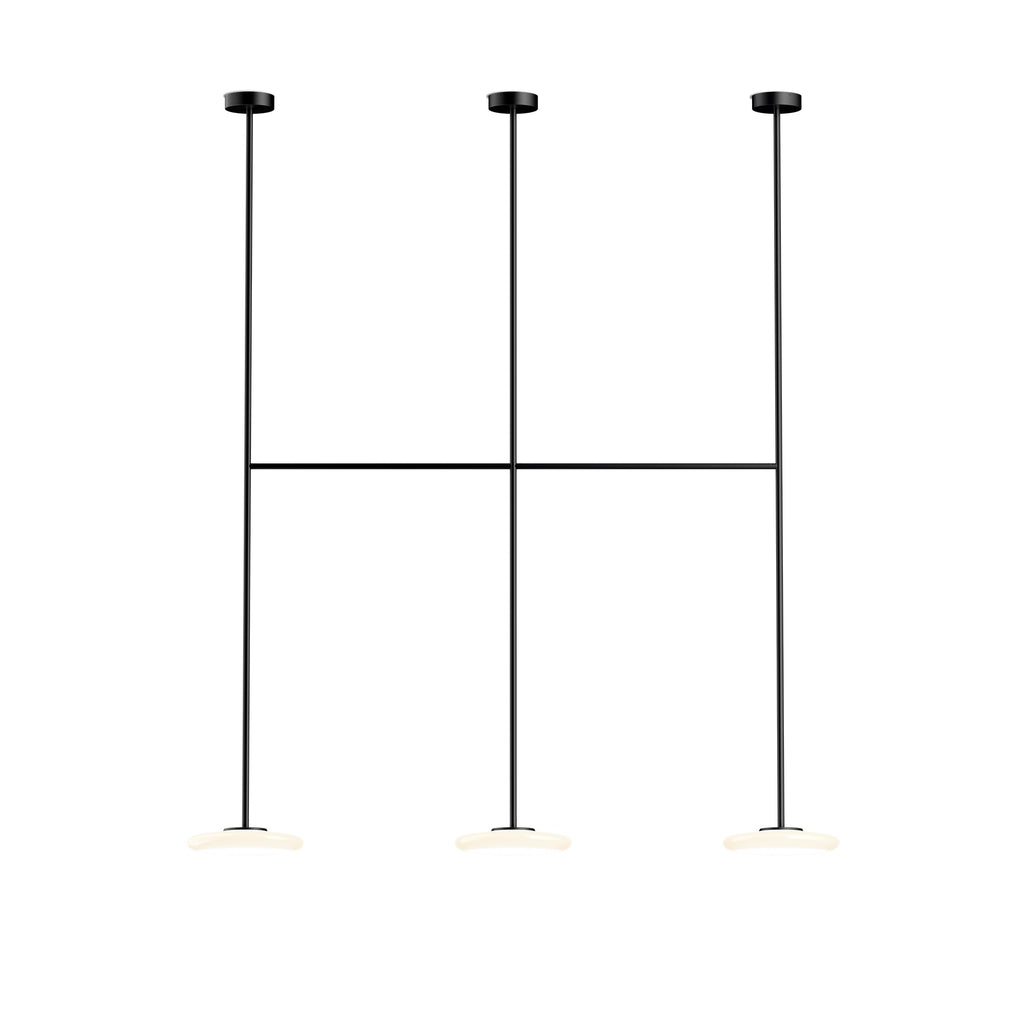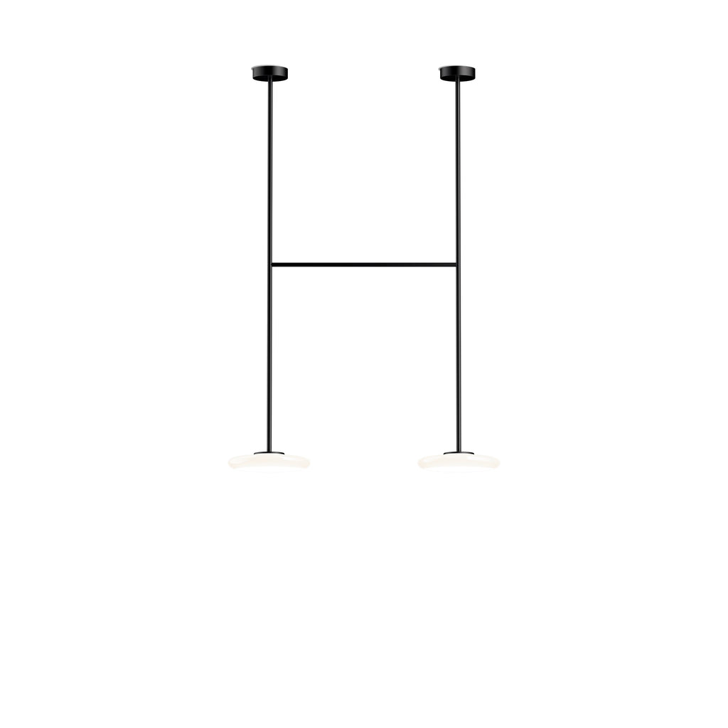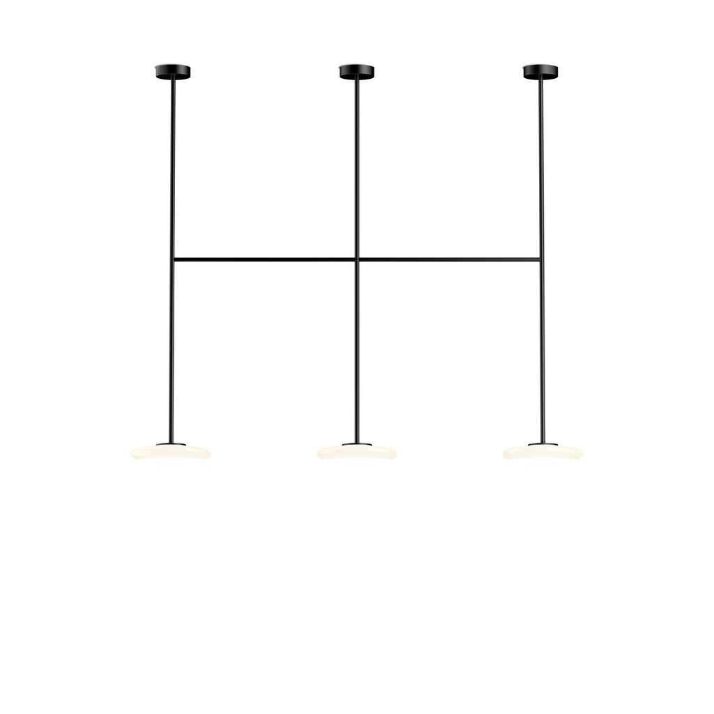 The serene shapes of the Ihana trace out a silhouette of light. This lighting system consists of several opal blown glass diffusers that are pleasing to the eye, appear ductile and contrast with the firmness of the metal structure that determines its shape and fastens it to the ceiling.