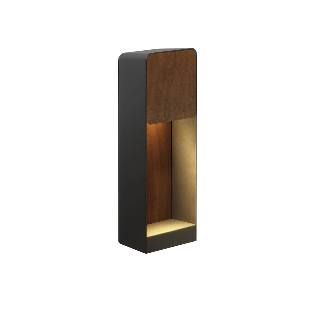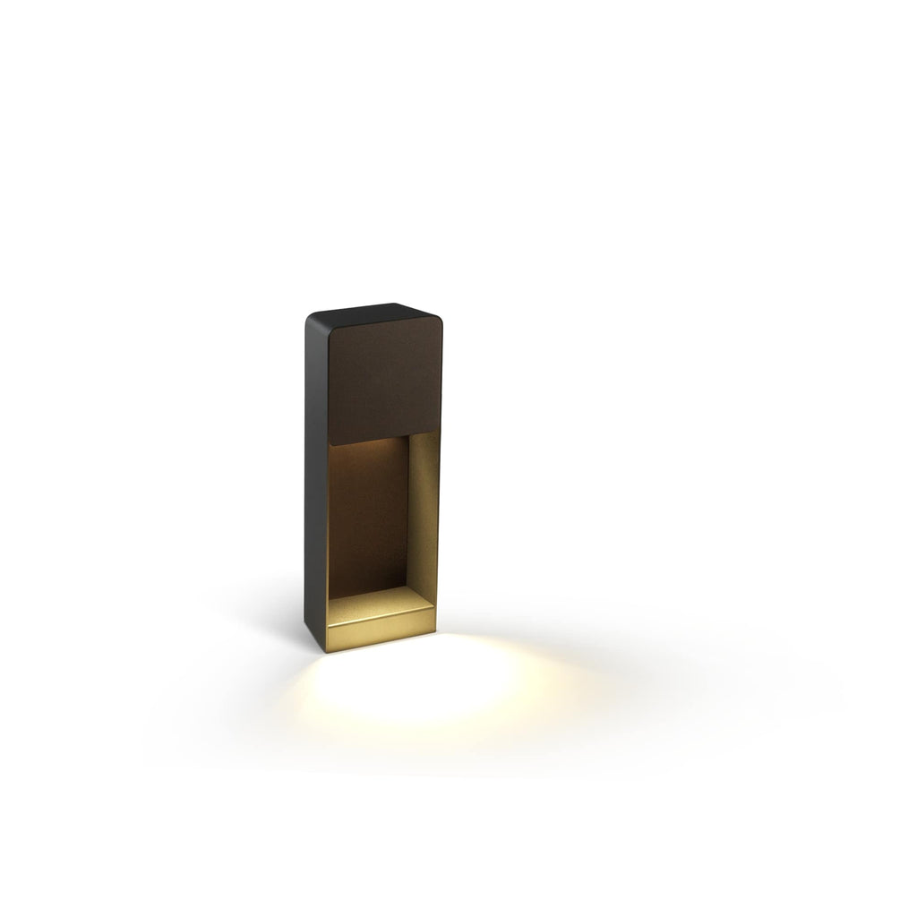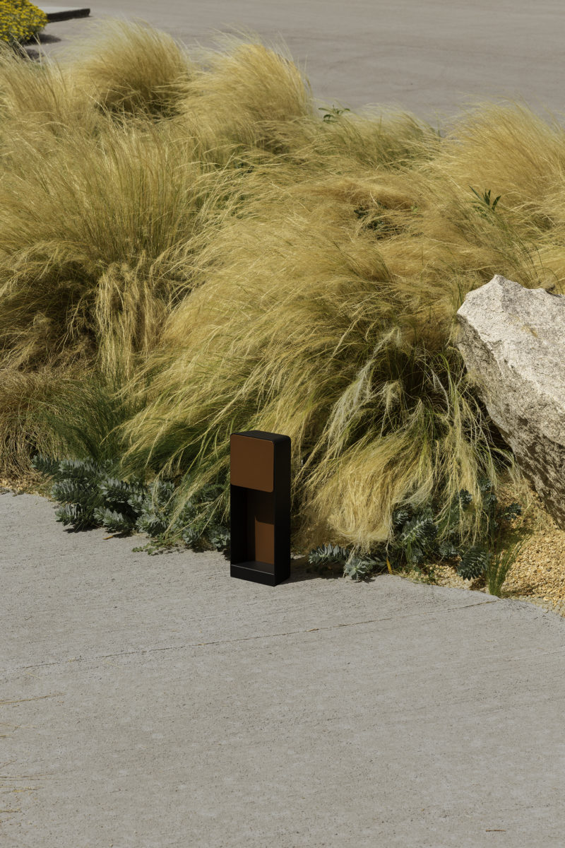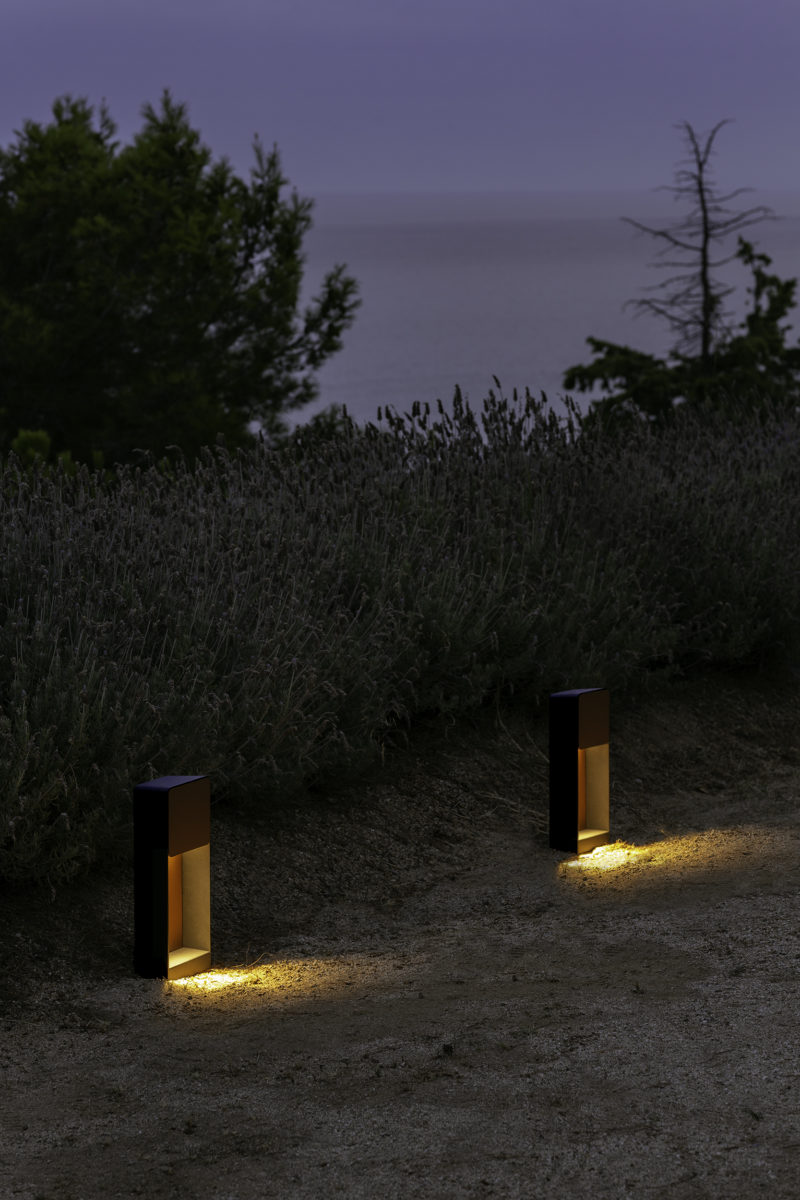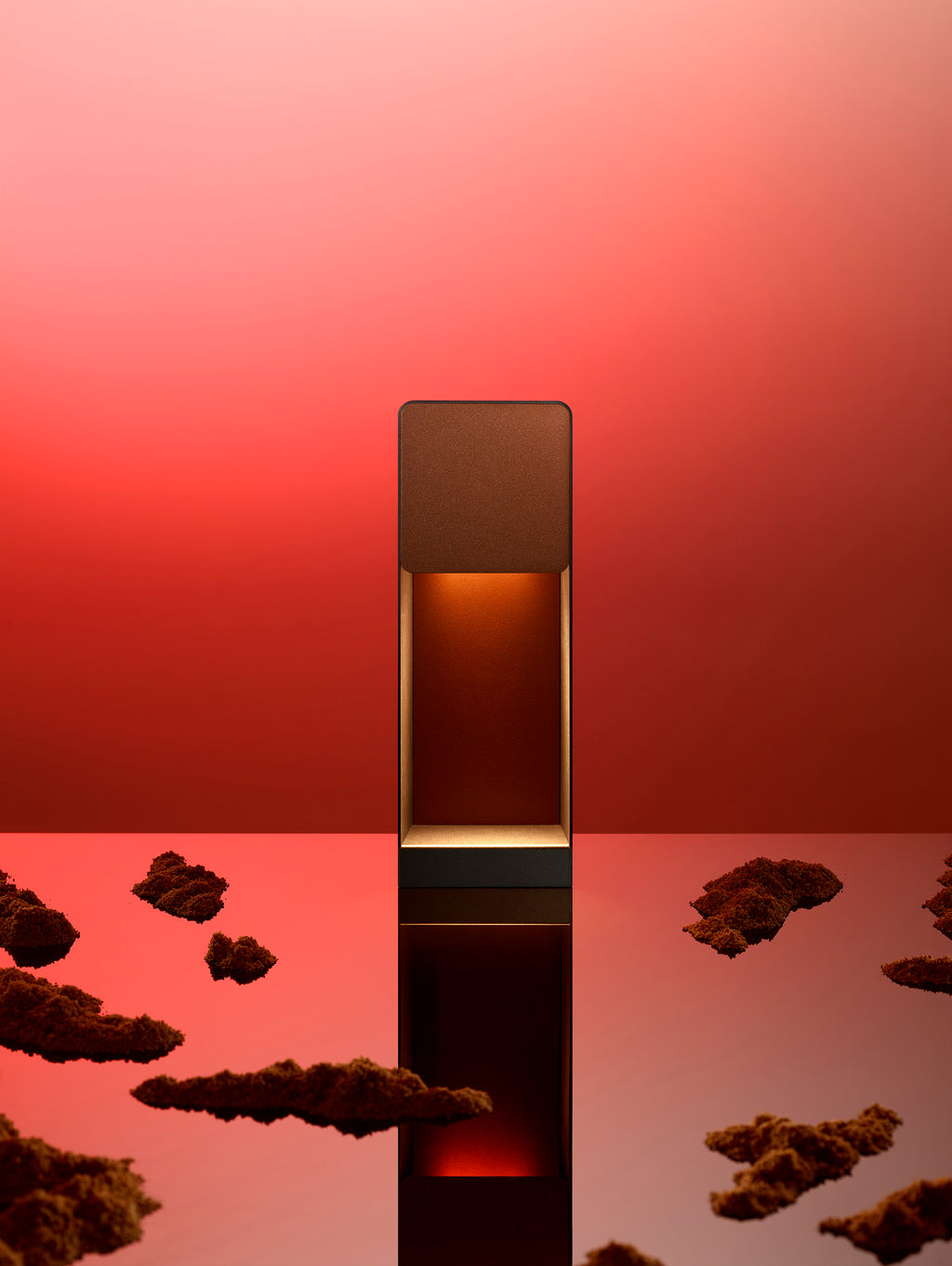 The bollard models are supported by an aluminium structure, with a hollow interior space to allow for maximum interplay of light and material. The surface of the design shines through: painted sheets of metal or iroko wood will provide different types of lighting via reflection.
