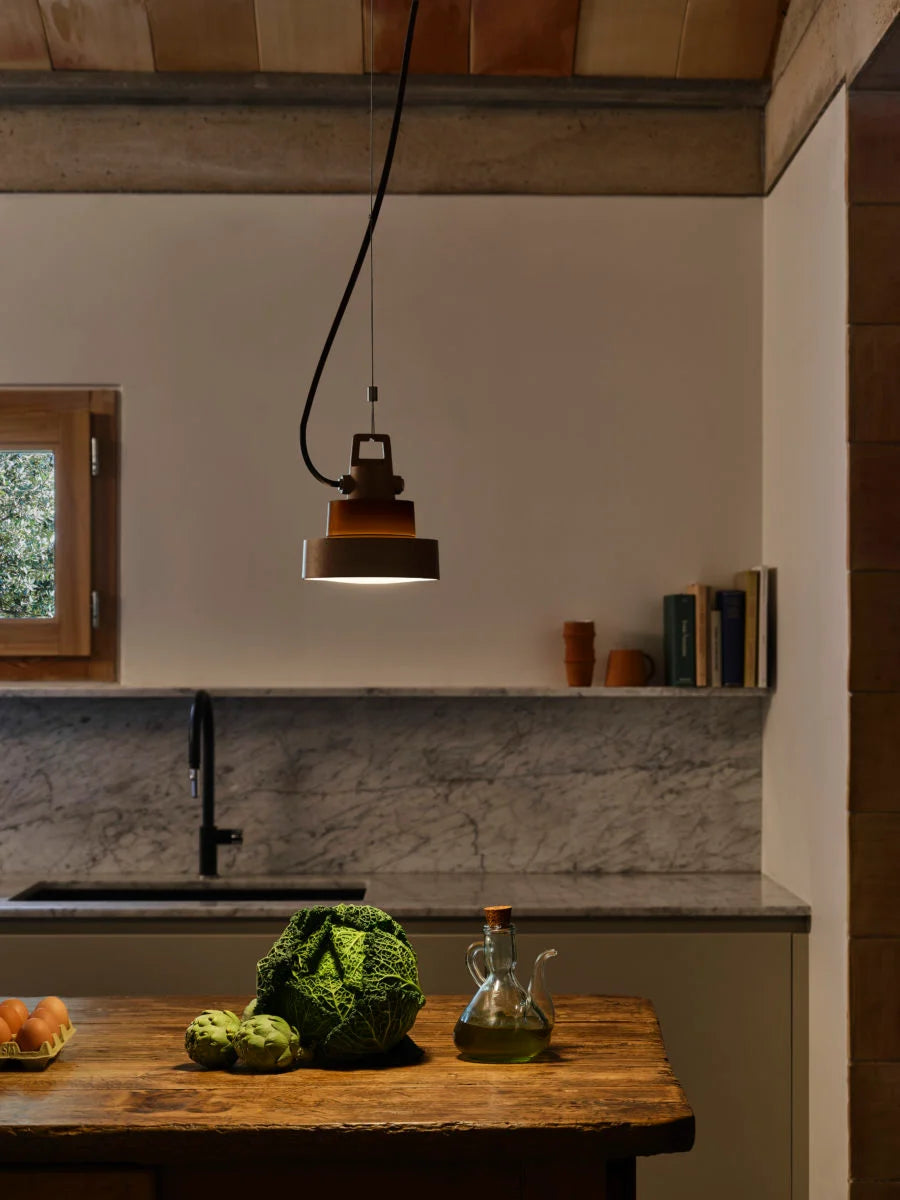 The quality of a product’s design lies in whether or not it withstands the test of time. Plaff-on!, by Joan Gaspar, has been illuminating indoor and outdoor ceilings and walls for more than a decade, and recently, thanks to a bollard version, gardens as well. A collection that is now expanding to include a new pendant version with a totally industrial vibe. Solid and compact, its -6.2 inches-wide structure, in black or rust brown, surrounds the glass diffuser.