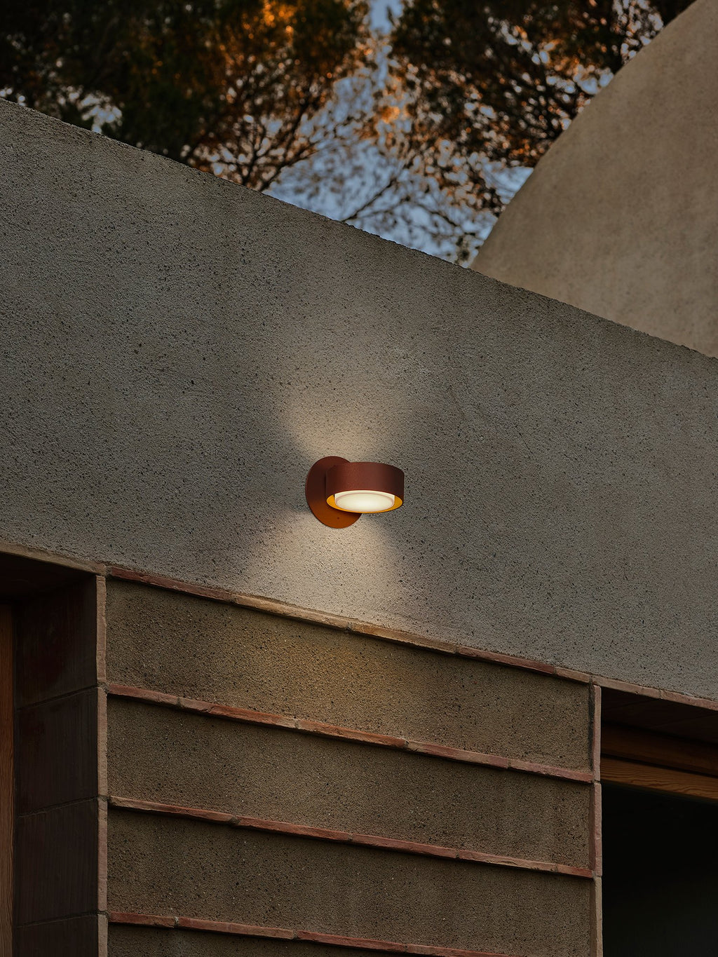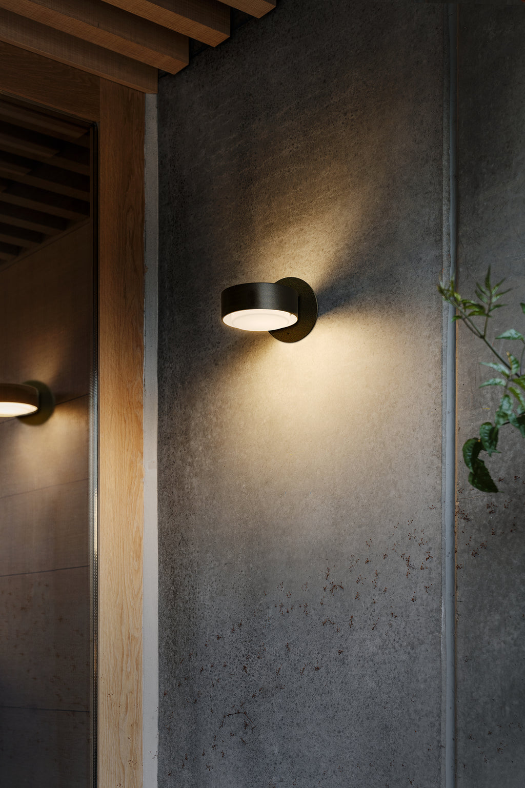 With the idea of expanding possibilities for the outdoors, the new Plaff-on! collection implies a change of direction in its lighting. The new outdoor wall version by Joan Gaspar —6,2 inches in diameter— features a perpendicular mount to project the light downward while still allowing light to flow smoothly through the open top. As with the standard Plaff-on!, the blown-glass diffuser of the outdoor versions seems to float, detached from the aluminium ring that surrounds it. Its light filters both downward and upward in a luminous halo, exuding simplicity and utility.