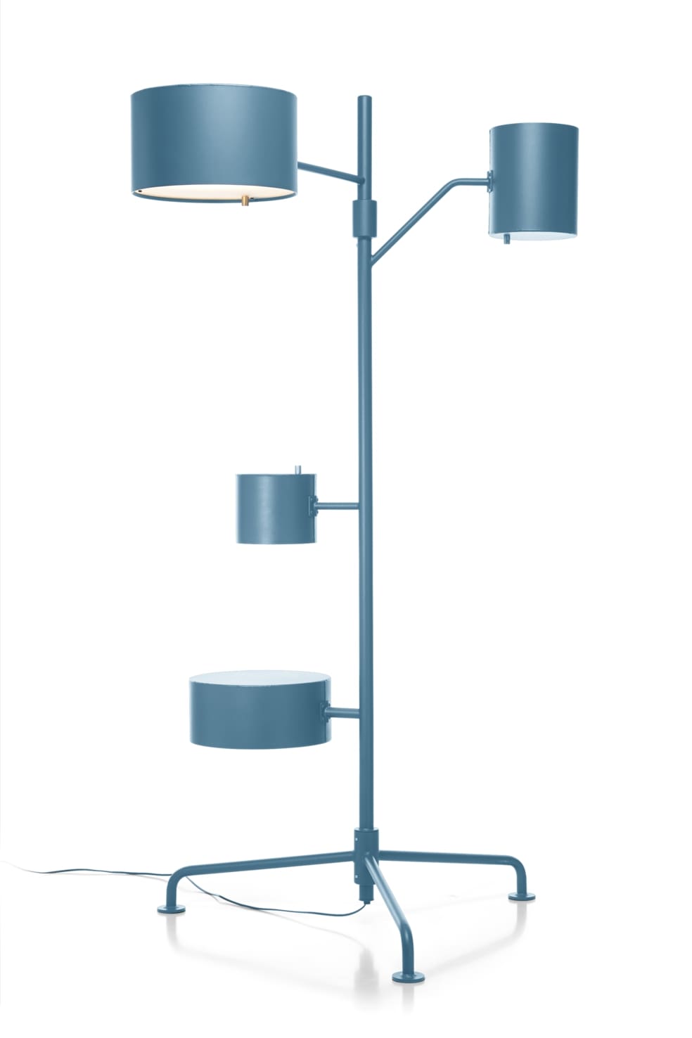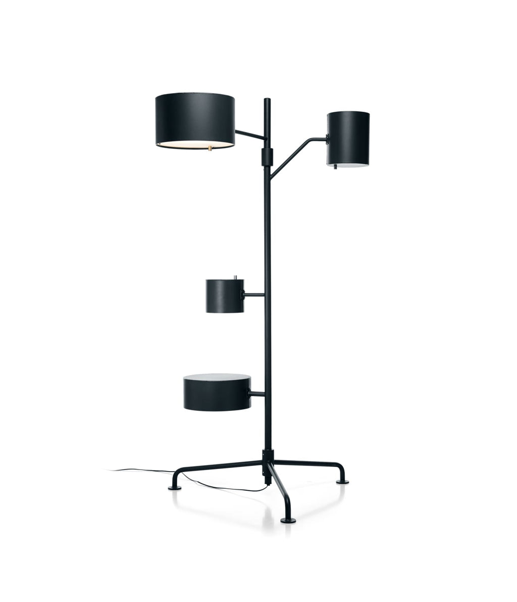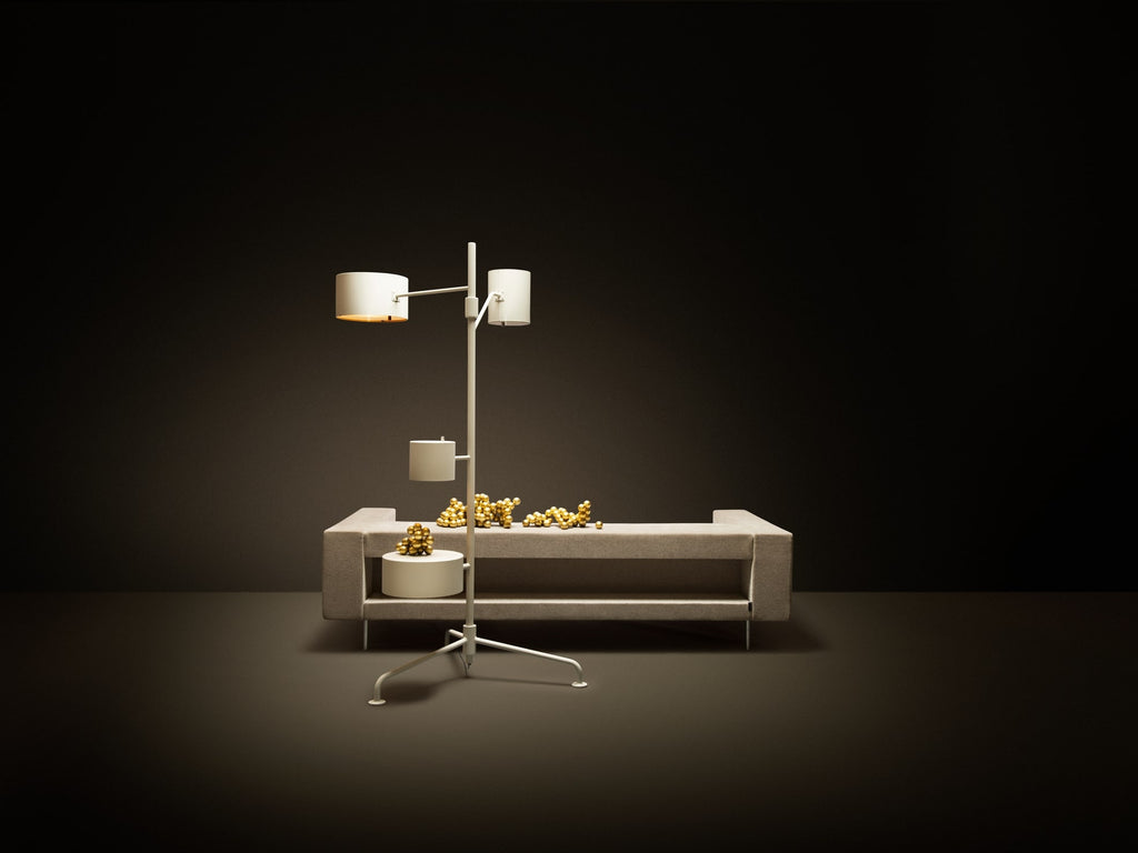 The floor lamp’s lean aluminium body is really multifunctional with its towering two meters and all-embracing light beams, the tallest shade projecting light towards the ceiling while the wider shade acts as the perfect reading lamp. And what about the two other shades? The lowest is no shade … but a surprisingly useful side table. Perfect to support a laptop or your favourite drink, it’s always in the spotlight!