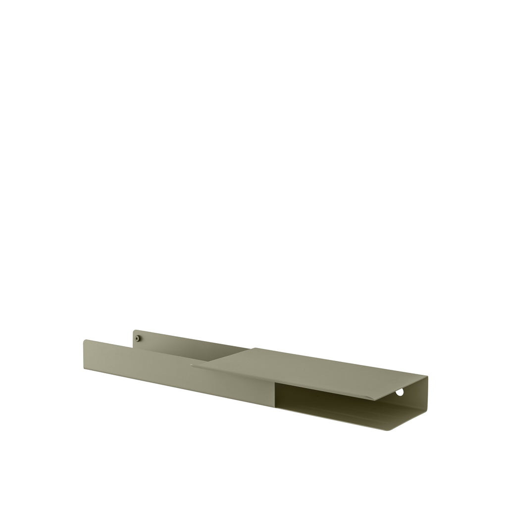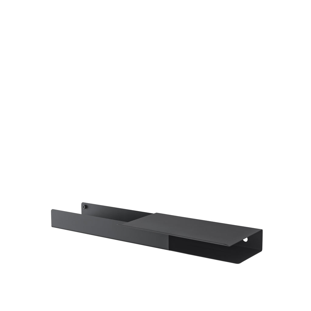 The Platform Shelf, imitating the look of folded paper yet shaped in metal, has a contemporary, functional character. It comes with two hooks and two bolts for mounting on the wall. The platform design provides a versatile surface, perfect for displaying decor or organizing essentials. The Platform Shelf is a modern and friendly way to add storage to any home or professional space.