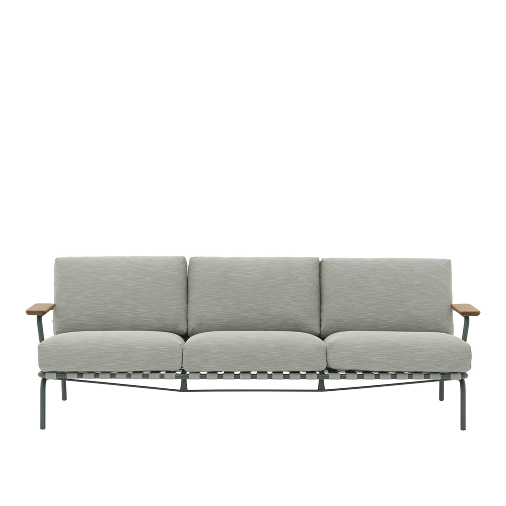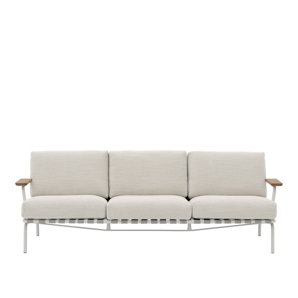 Settle Outdoor Sofa invites you to settle into its comfort, providing an ideal setting for enjoying the outdoors all day. Its airy steel frame, complete with visible belts and intricate details, enhances its visual allure from all angles, while its armrests, made from FSC™-certified (FSC-C028824) sapele mahogany wood, add a warm, tactile feel. Settle’s steel frame is galvanized, primed and powder-coated, ensuring corrosion resistance for long-lasting use. The plush cushions, made with quick-dry foam and durable outdoor textiles, offer fast-drying resilience in rain showers and year-round durability when used with an outdoor cover.