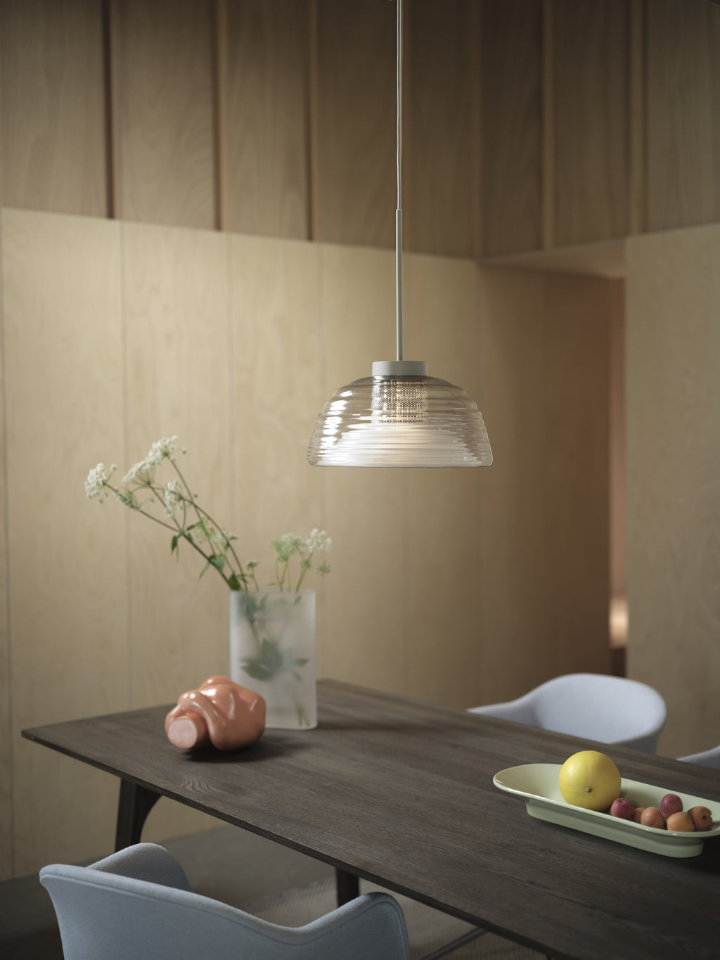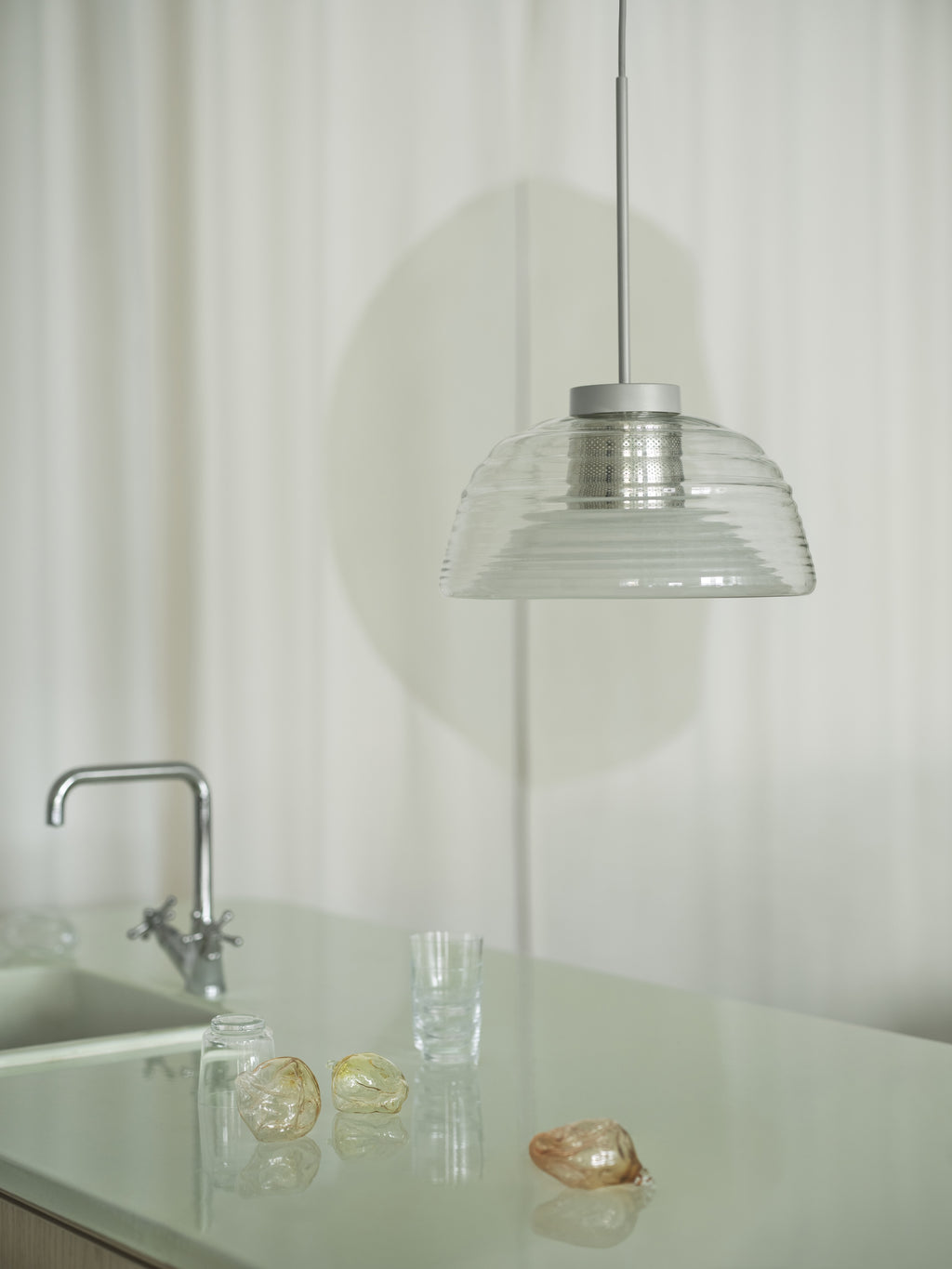 The Two-Layer Pendant brings new perspectives to the classic glass pendant with its rippled, mouth-blown glass, creating unique optical effects from different angles. This refined design combines clear and frosted glass with a punched steel mesh, providing ample, glare-free light. The blend of glossy and matte finishes creates a harmonious, sculptural form that acts as a self-illuminating sculpture. Perfect for dining settings or above counters, it adds visual intrigue and elegance to any space.