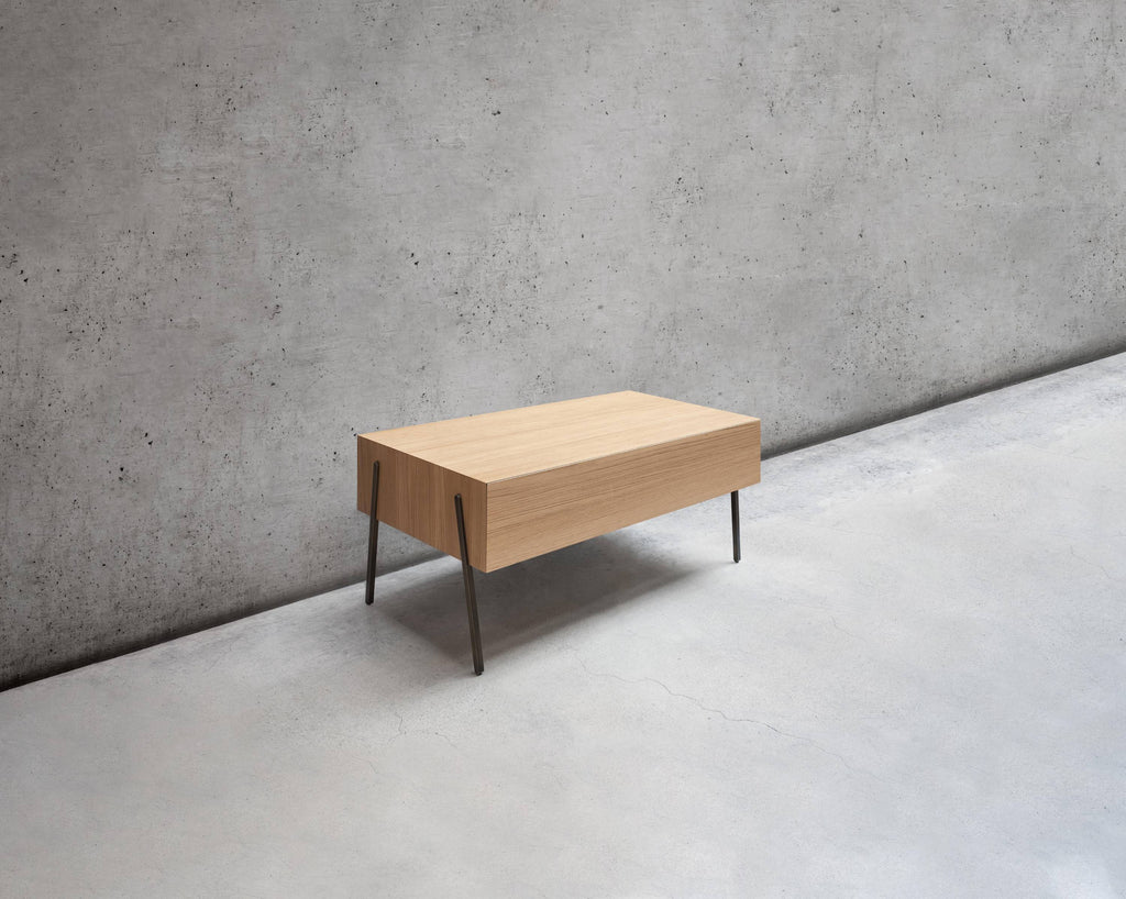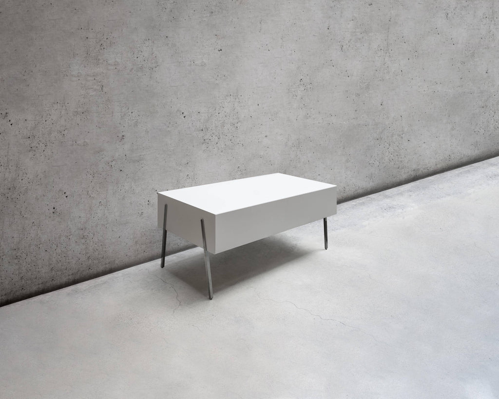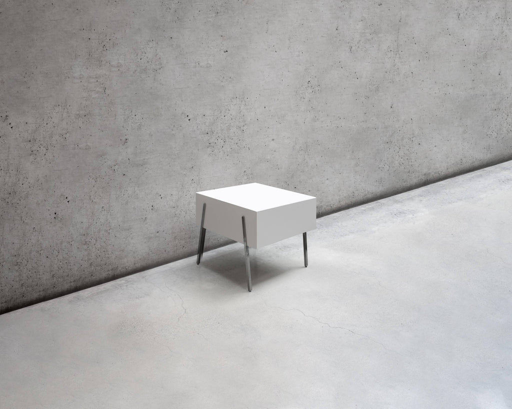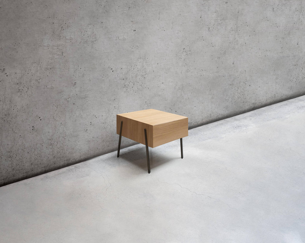 Elevated by four slender metal legs the geometric Into cabinet floats above the floor surface. With generous internal storage a bedside application is ideal although it also serves well as side table.