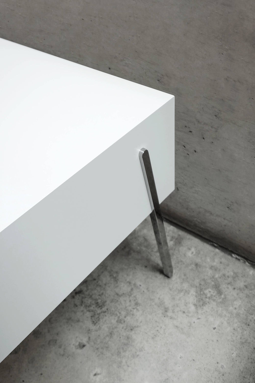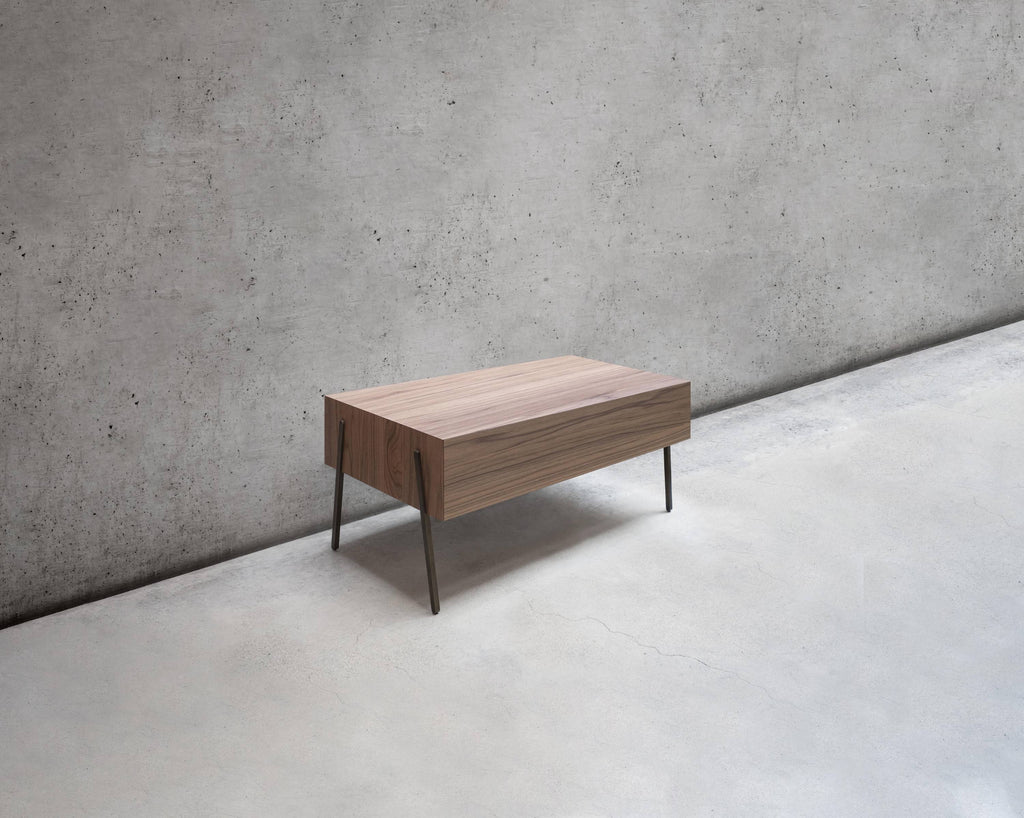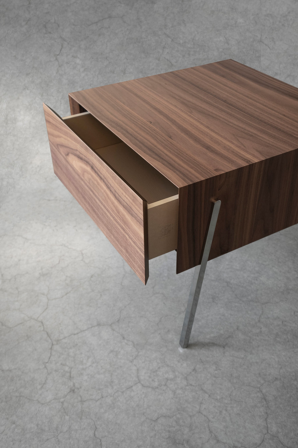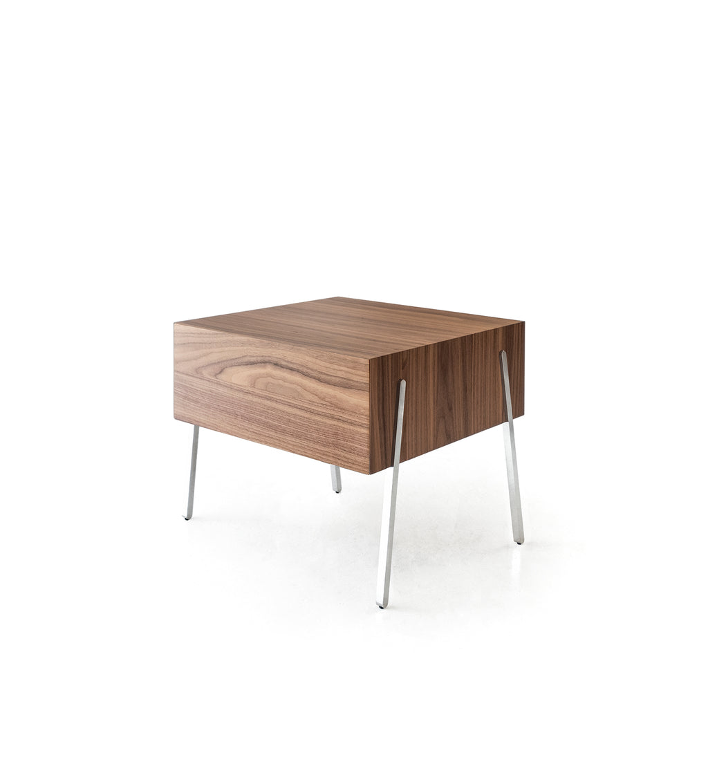 Elevated by four slender metal legs the geometric Into cabinet floats above the floor surface. With generous internal storage a bedside application is ideal although it also serves well as side table.
