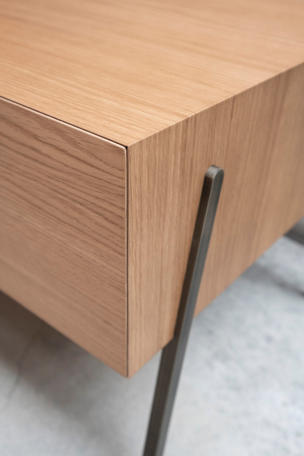 The minimalist form of the cabinet augments the excellent construction and craftsmanship. Available in a variety of curated finishes the wood surface exemplifies the attention to detail. Following the top surface grain the texture wraps the edges and cascades down the sides creating a continuous visual effect.