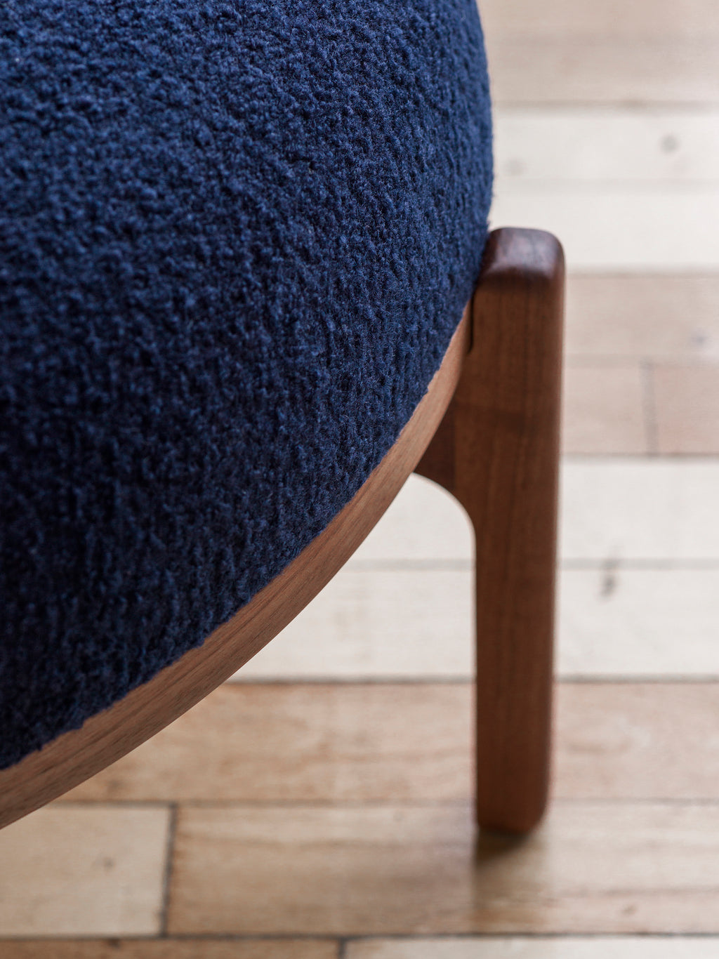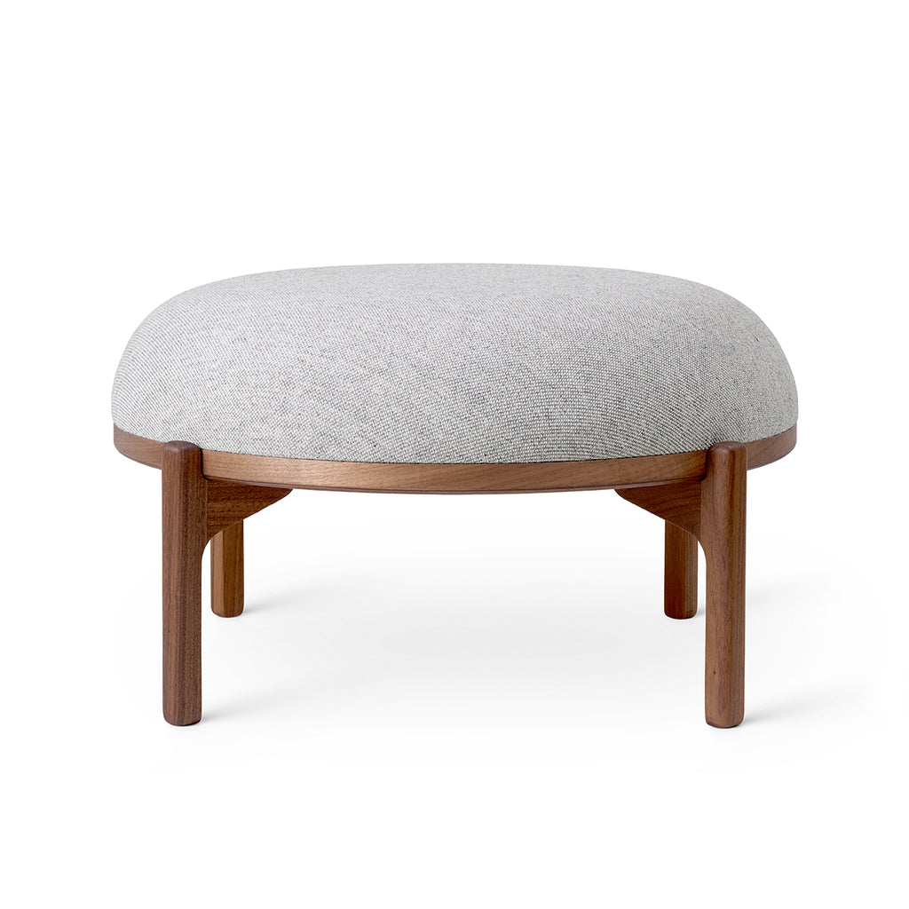 The Sideways Footstool is characterized by its soft shape and fine details that refer to the Sideways Sofa; the solid wooden frame and the distinctive legs, highlighting the elegance of the wooden features in the same way as the sofa does. The organic silhouette of the footstool is a classic trademark of Rikke Frost. The textile is cut from a single piece of material and must be stretched over the foam so that the weave of the fabric remains straight without wrinkling – a task which only the most experienced upholsterers can master. Available in textile upholstery with FSCTM-certified oak in all finishes and walnut in oil or lacquer.