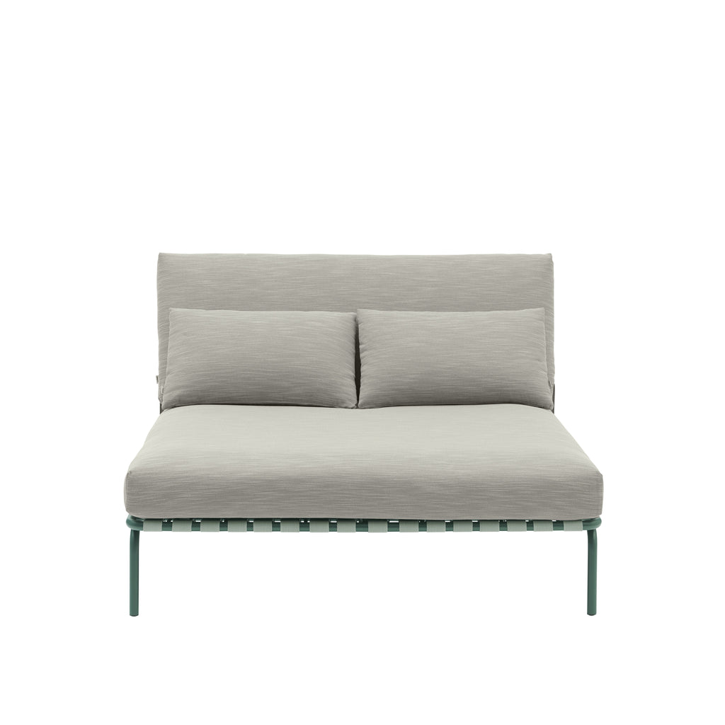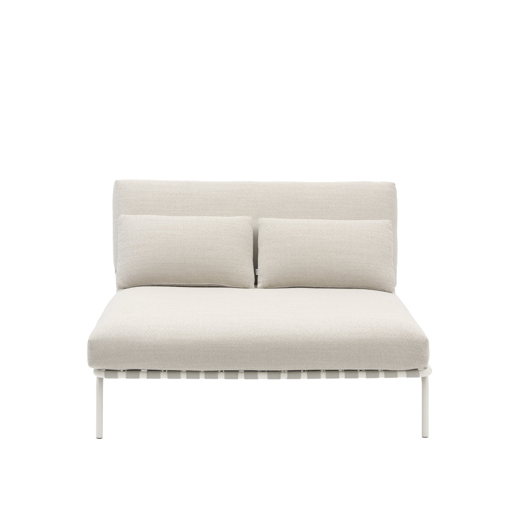 The Settle Lounge Bed invites you to settle into its comfort. With its deep, leaned backrest and extra cushion for added comfort, it's ideal for long, leisurely hours spent unwinding outdoors. Its airy steel frame, complete with visible belts and intricate details, enhances its visual allure from all angles, while its armrests, made from FSC™-certified (FSC-C028824) sapele mahogany wood, add a warm, tactile feel. Settle's steel frame is galvanized, primed, and powder-coated, ensuring corrosion resistance for long-lasting use. The plush cushions, made with quick-dry foam and durable outdoor textiles, offer fast-drying resilience in rain showers and year-round durability when used with an outdoor cover.