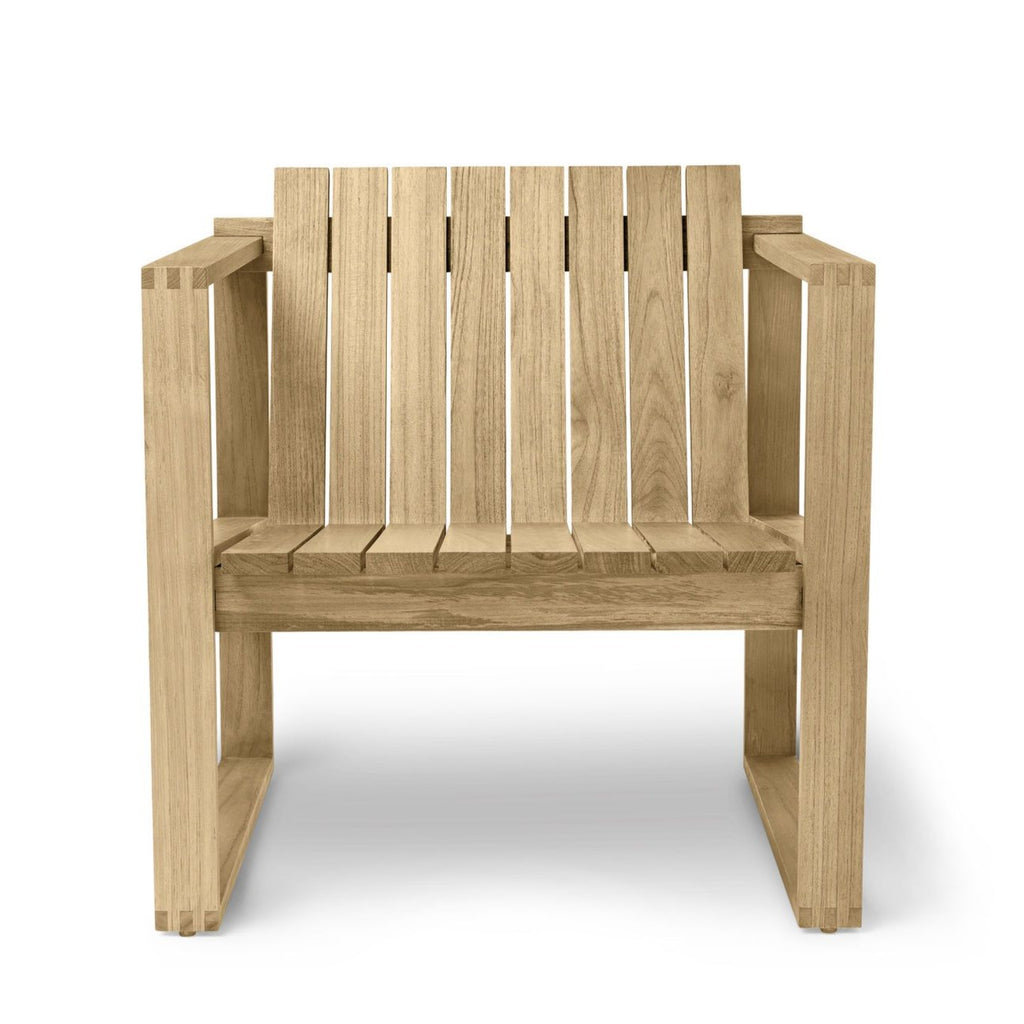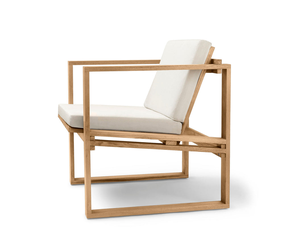 The BK11 lounge chair was designed in 1959 by Danish architect Bodil Kjær as part of her architecturally inspired Indoor-Outdoor Series. With a linear form influenced by Cubism, the chair’s solid teak construction is designed to patinate beautifully with age and use. The result of expert craftsmanship, the chair’s design has an inclined seat and back, with armrests, legs and runners that are mortised together to form two squares. It can be supplied with slender, supportive cushions made from weather-resistant Sunbrella fabric for additional comfort.