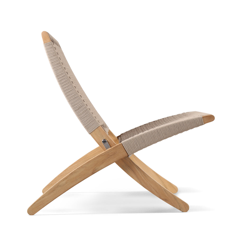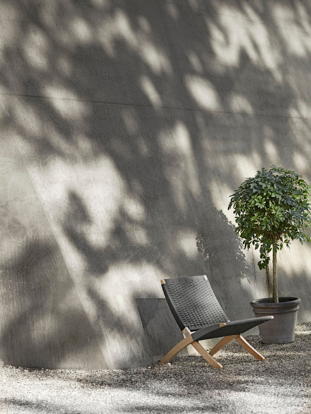 This folding lounge chair is ideal as an extra or permanent fixture. Its light and foldable frame can easily be hung on a wall or placed on a floor stand for convenient storage. Meanwhile, the chair has all the elegance of a sculpture with its natural materials, clean cotton webbing and evident craftsmanship. In short, it beautifully embodies the concept of complex simplicity.