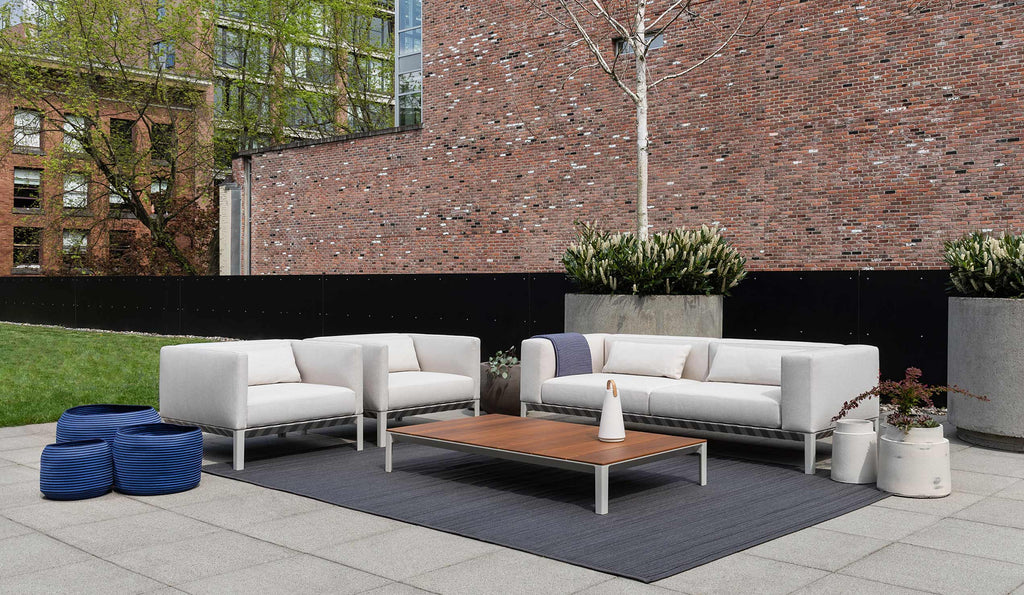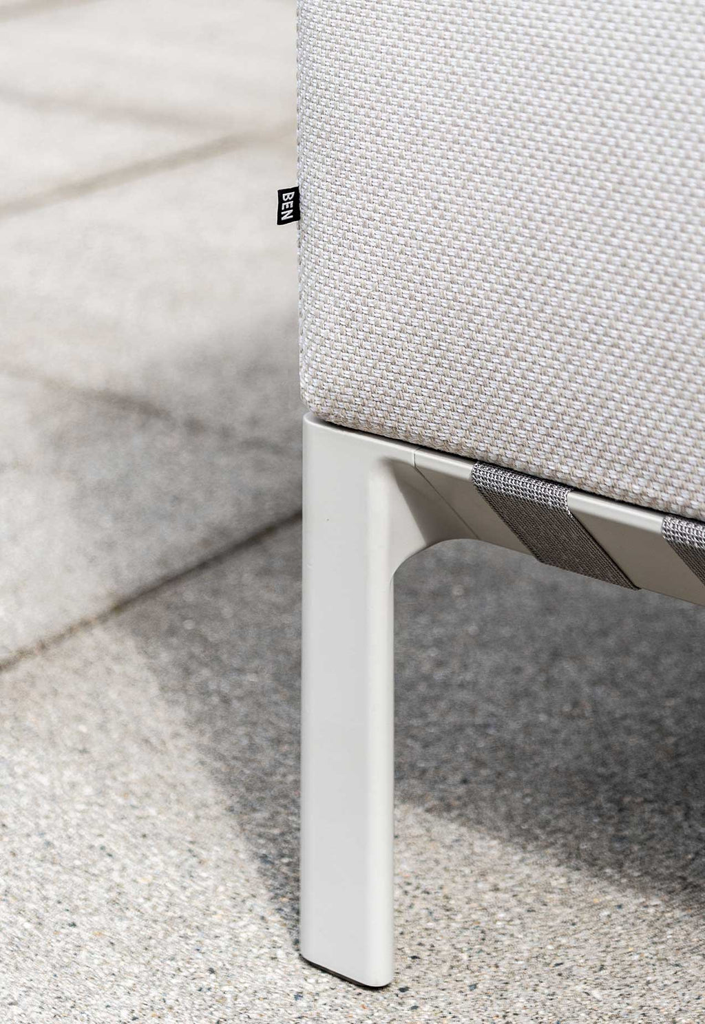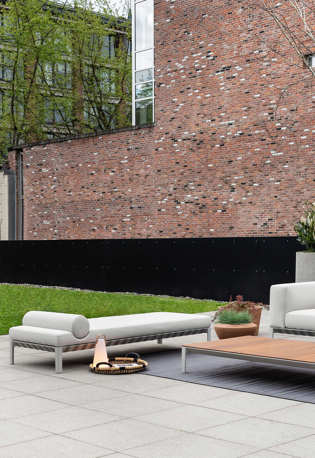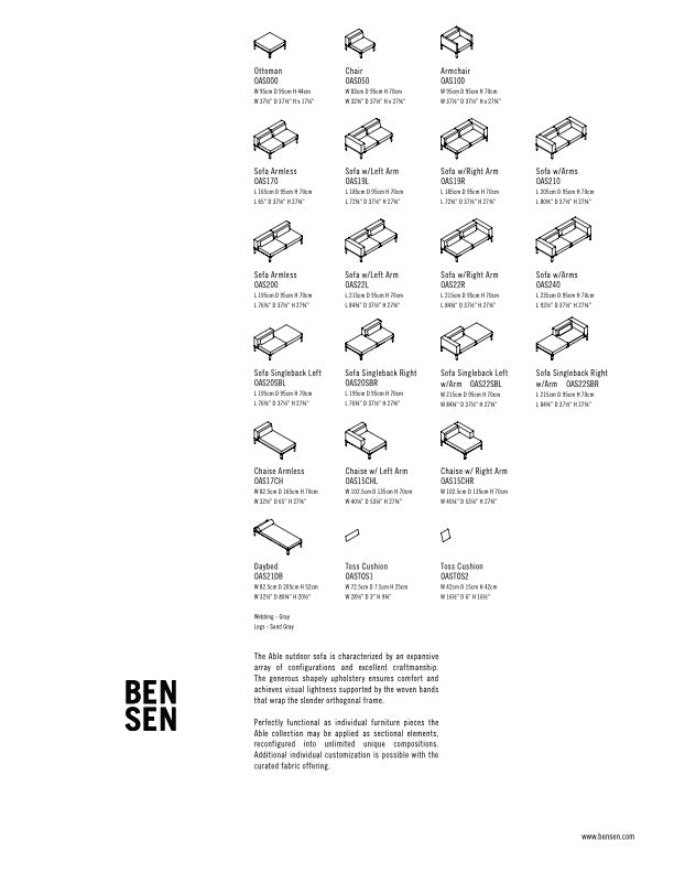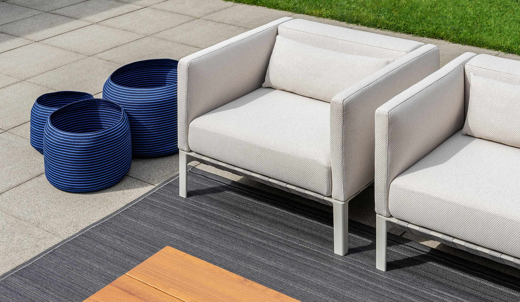 The Able outdoor collection is characterized by an expansive array of configurations and excellent craftsmanship. The generous shapely upholstery ensures comfort and achieves visual lightness supported by the woven bands that wrap the slender orthogonal frame.