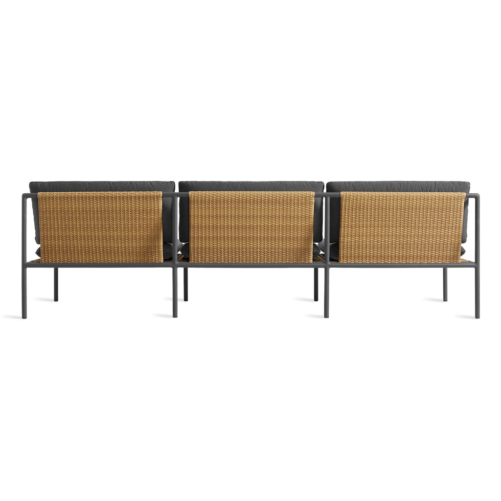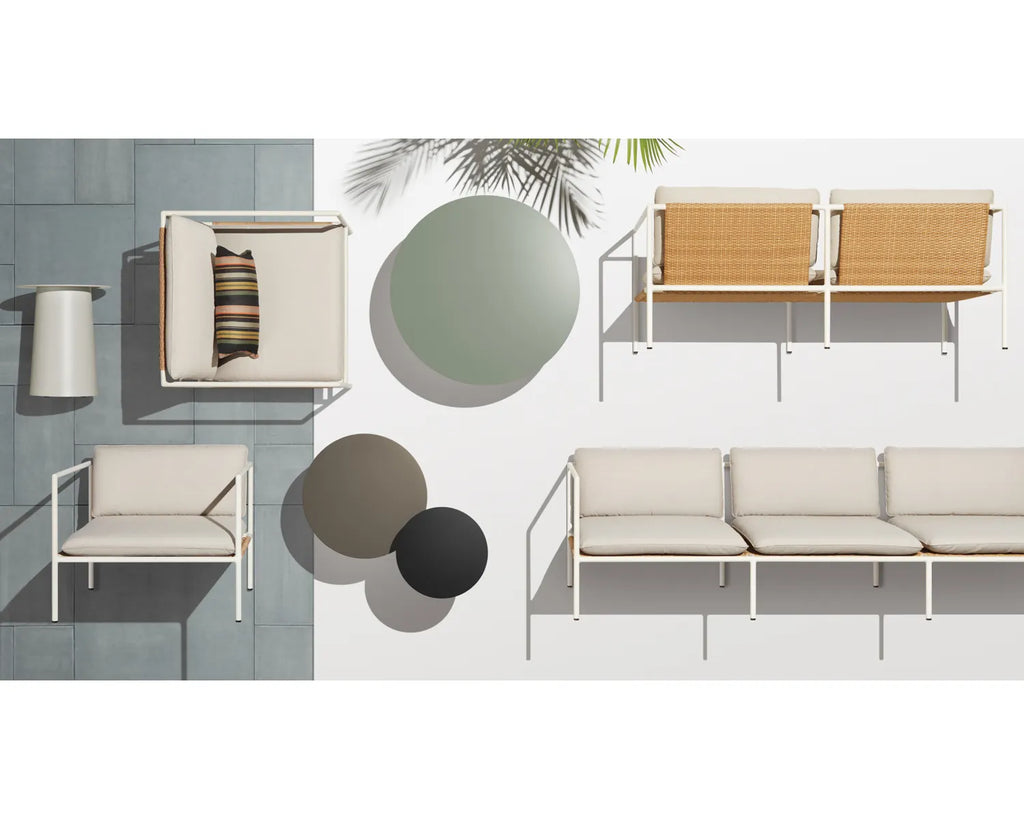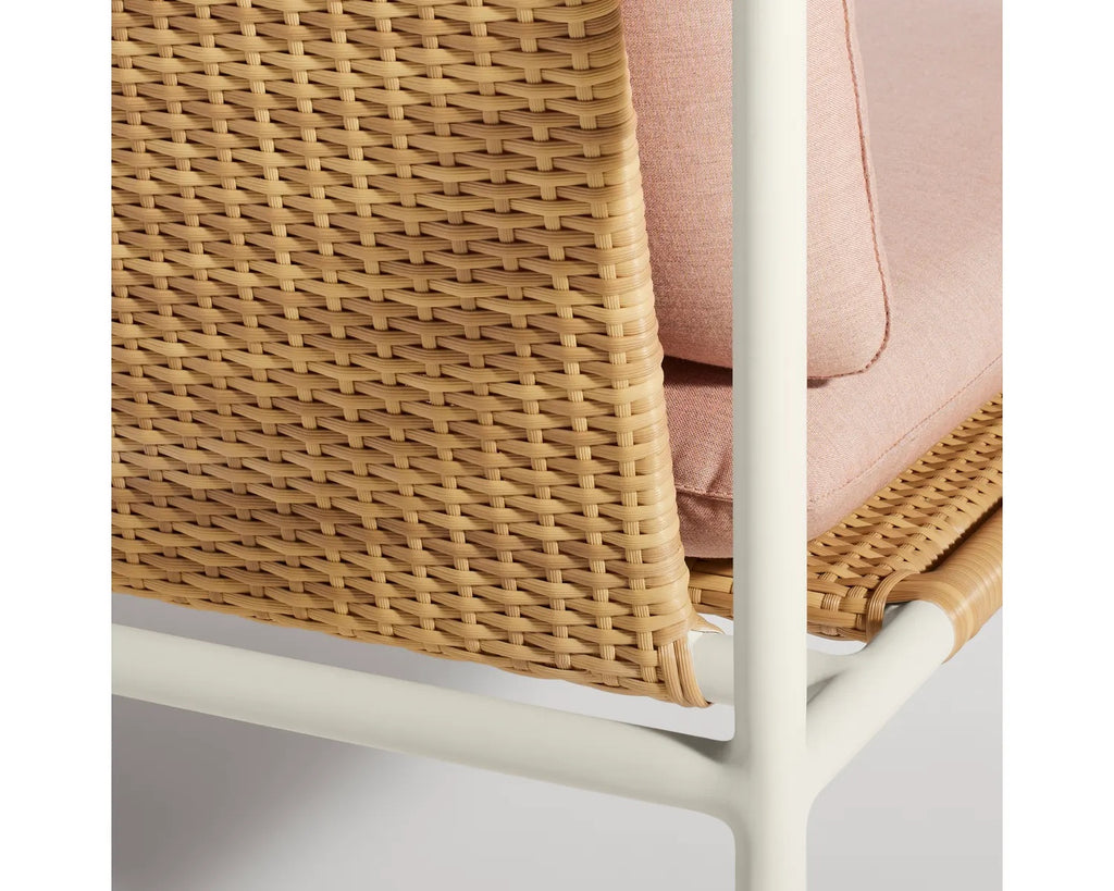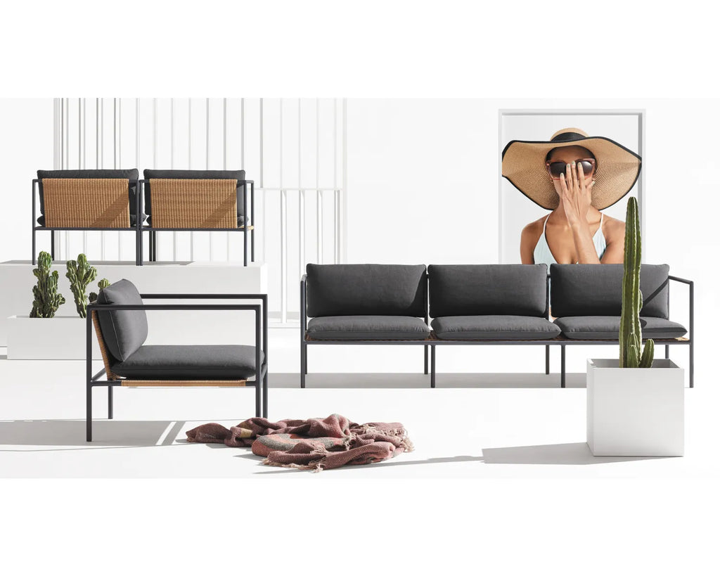 All-weather rattan adds hand-woven texture to an architectural tubular aluminum frame. Designed to have great vistas from all angles, Dog Days is what happens when a minimalist goes on vacation and gets in touch their inner hippy. Seat and back feature ravioli style cushions upholstered in high-performance, mildew and fade resistant Sunbrella™ fabric.