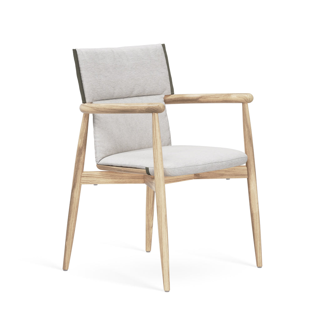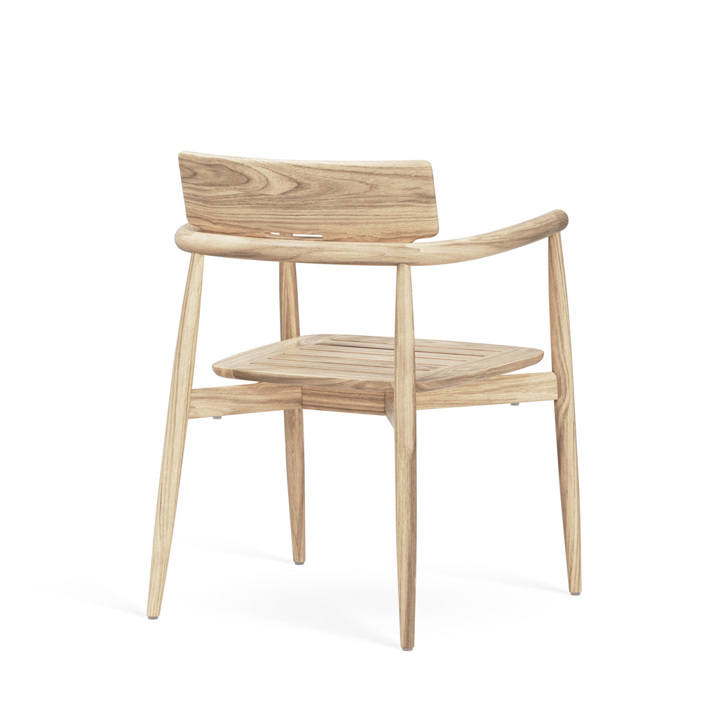 Continuing the exploration of perfection and imperfection, EOOS has designed the E008 Embrace Outdoor Dining Chair that echoes a similar design language used in the EOO5 Embrace Armchair. The design trio has sought to create a new typology for outdoor furniture that offers an indoor dining experience. A soft upholstered cushion envelops a highly finished FSC™-certified teak frame, providing an elegant contrast of upholstery against sleek and precise woodwork. The removable cushion in durable, weather-resistant fabric allows for versatility of use and aesthetics, giving the untreated patina of teak a more prominent role and demonstrating the high level of craftsmanship found in the finger joints on the arms and truss assembly under the seat. The E008 Embrace Outdoor Dining Chair can also be stacked for storage and fits with the E022 Embrace Dining Table.