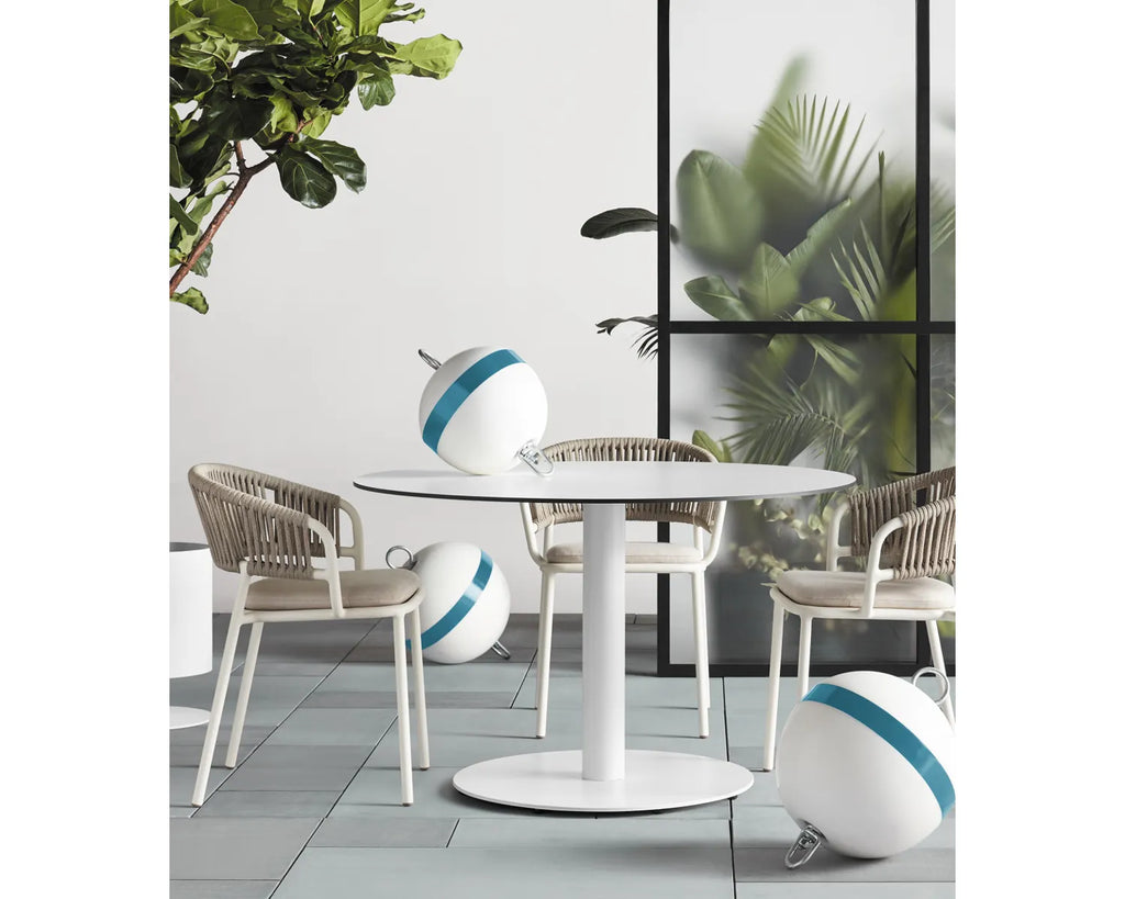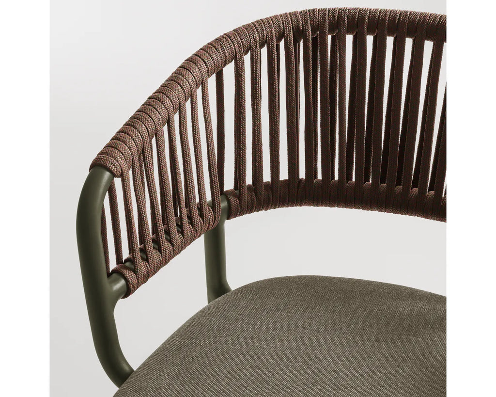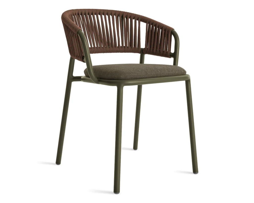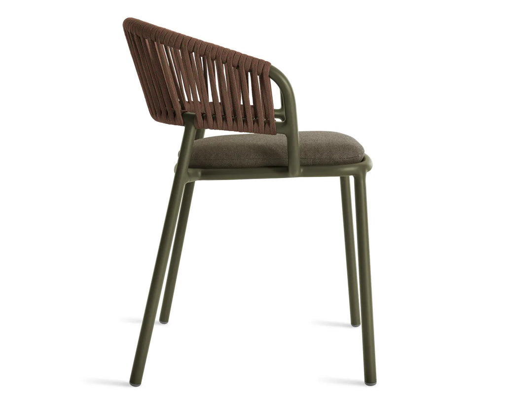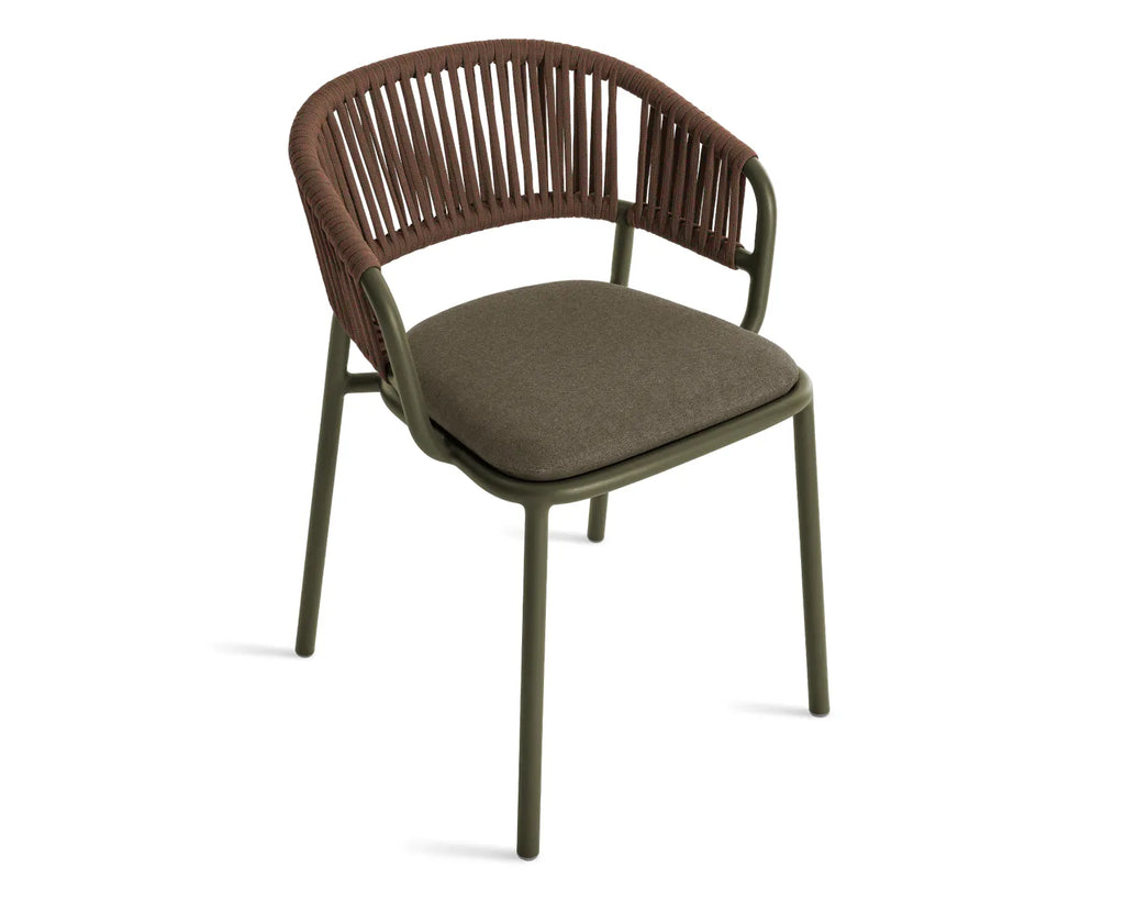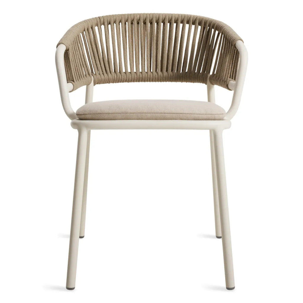 Tubular aluminum frame is wrapped up in all-weather woven rope to form a seat back that is textured, tender and tough. Dine, sip or caffeinate al fresco without disaster. Seat cushion is upholstered in UV- and mildew-resistant Sunbrella® fabric. Also available in Lounge Chair.