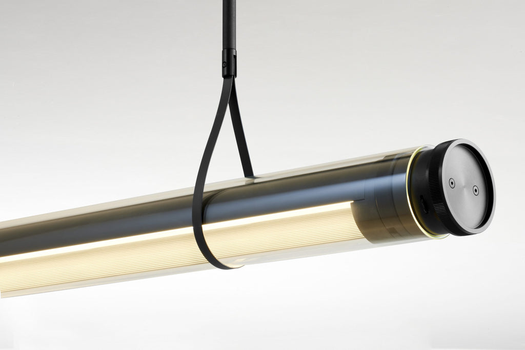 Its design consists of a glass tube that encases the light. What makes it unique is that the glass not only protects the light, but also provides a mechanical function, suspending the whole system and allowing the lamp to rotate and the light to be steered in a certain direction.