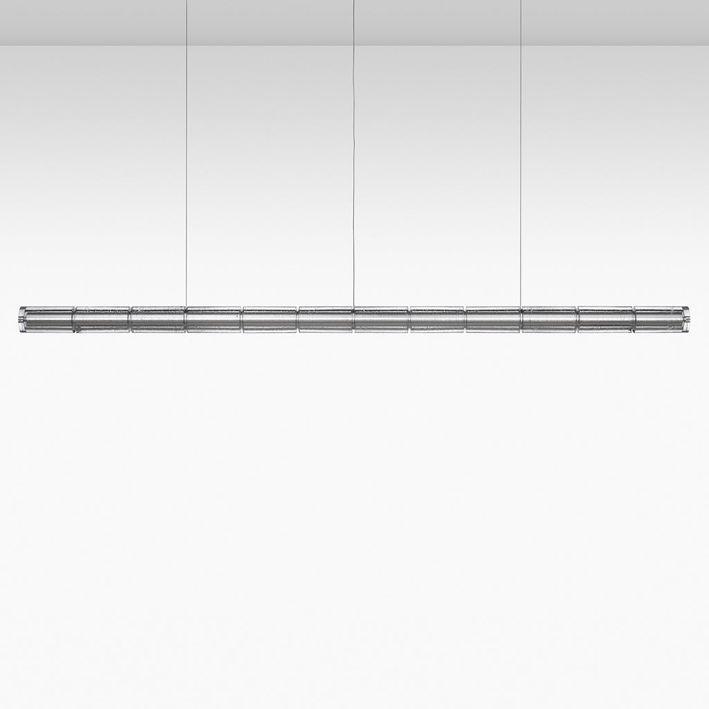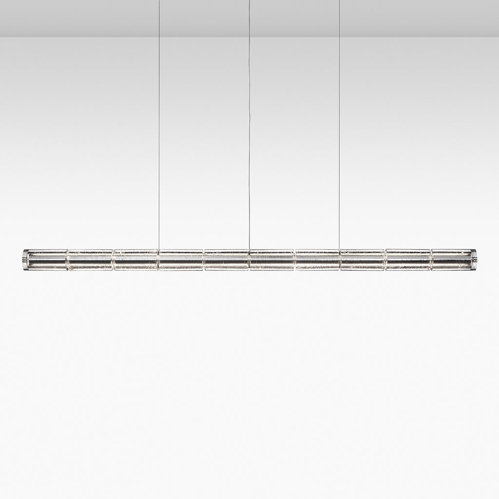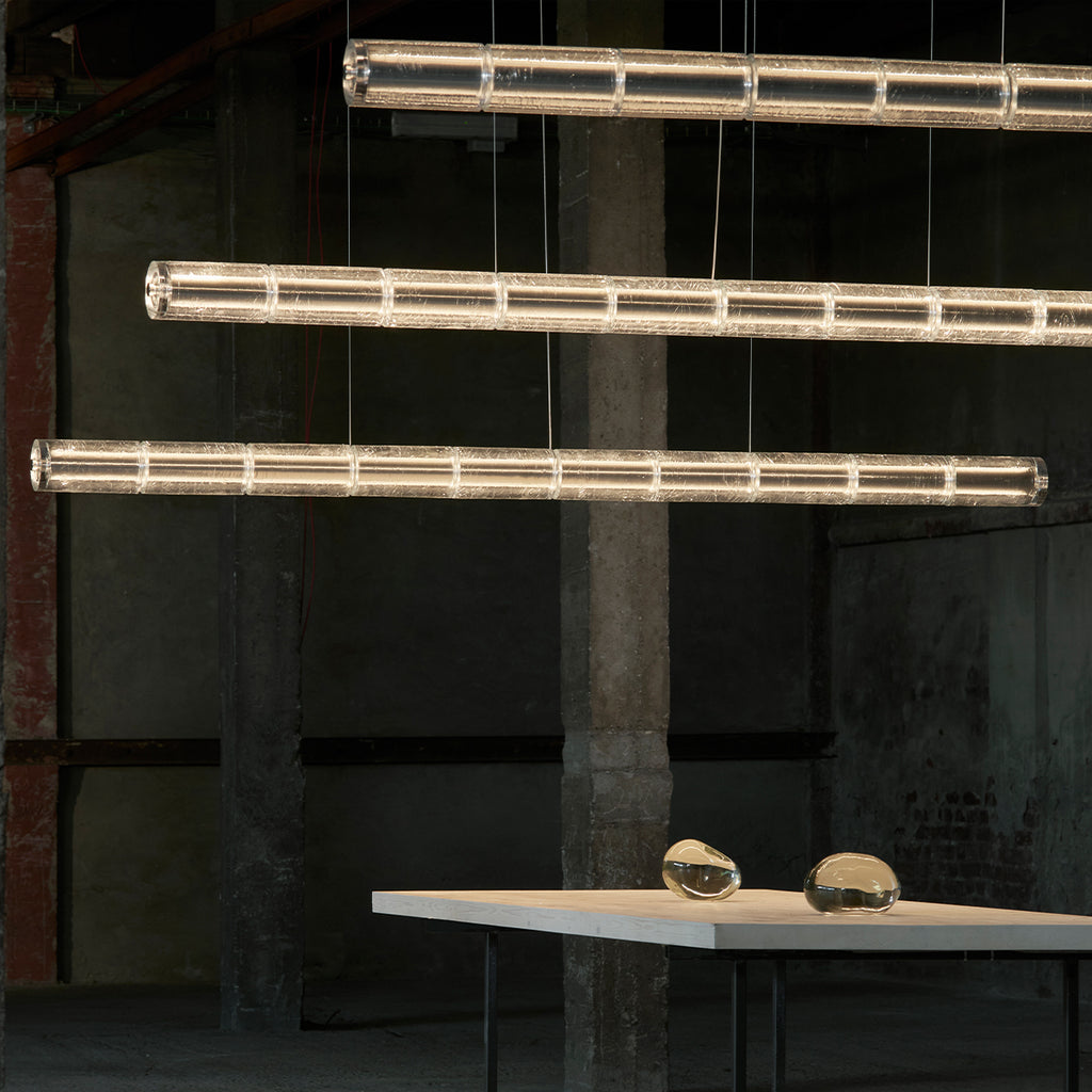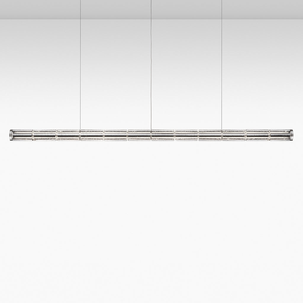 Although suitable for residential and commercial projects, it creates a remarkable artisanal quality, with craftsmanship evident in its intricate details. The glass cylinders are meticulously formed by pouring glass into a mold, with the glass maker's movements imprinting unique markings on each piece.