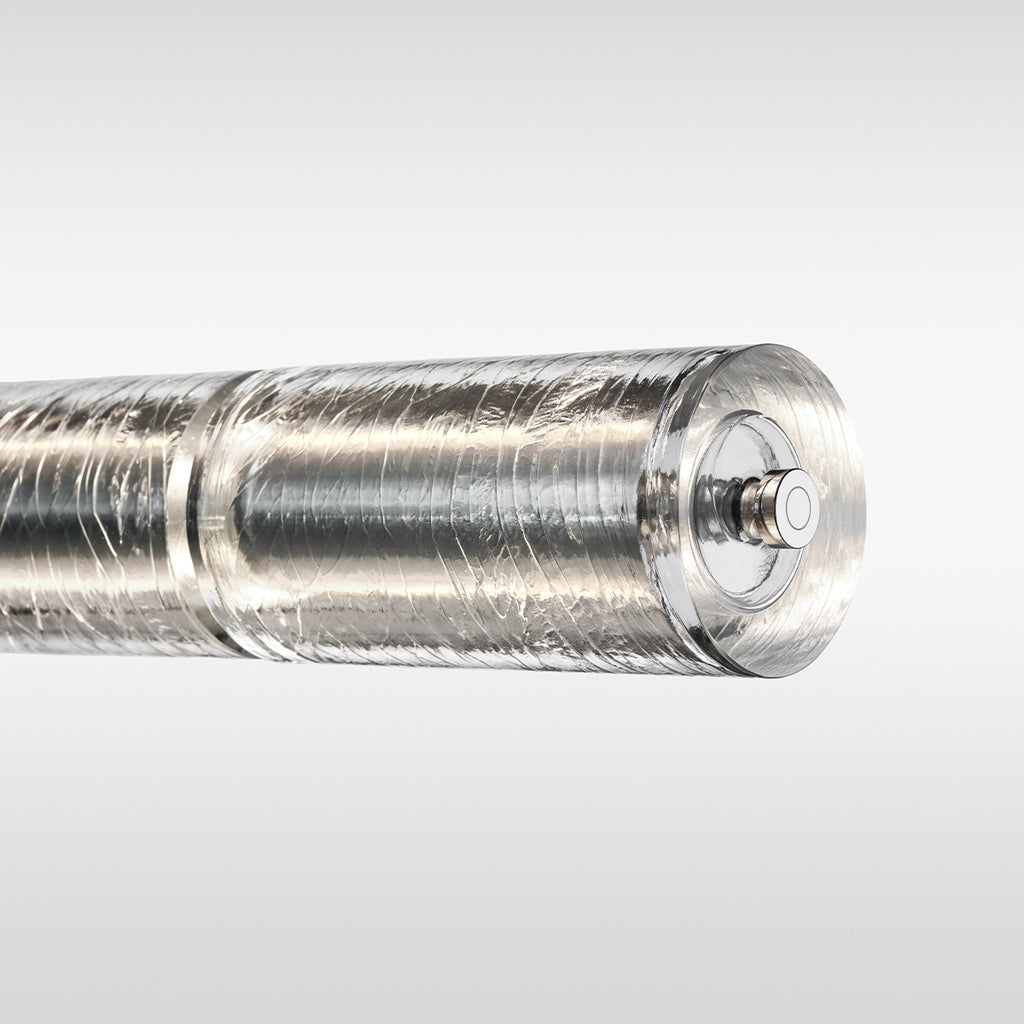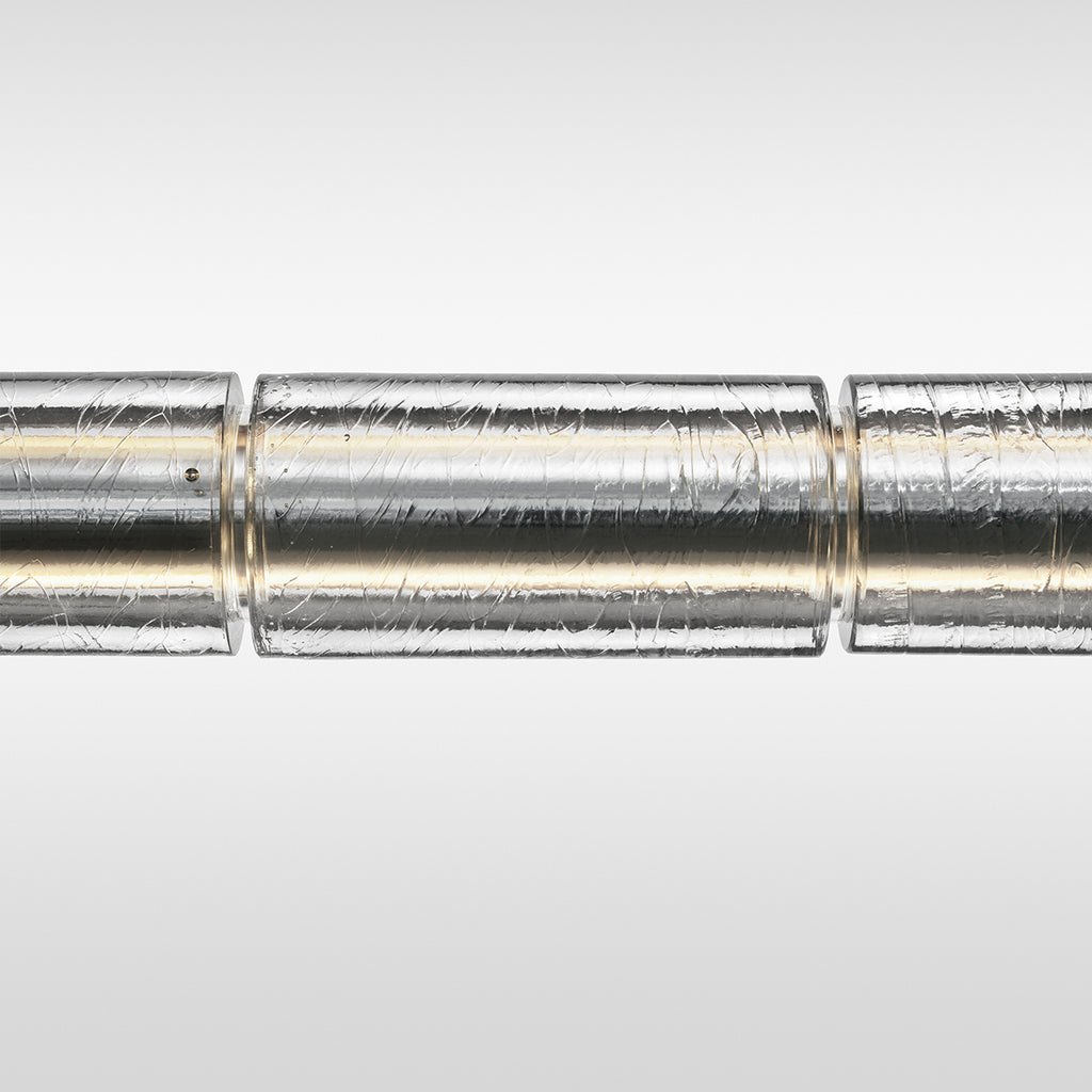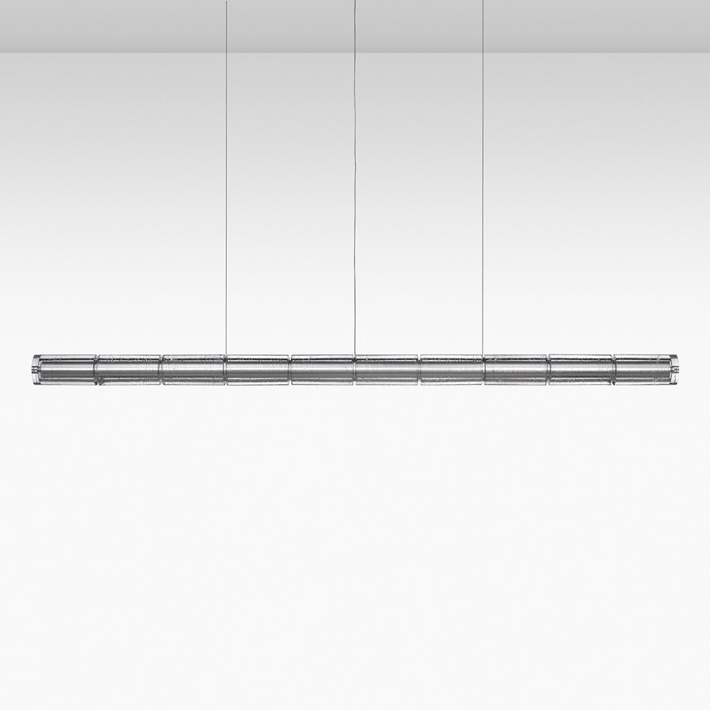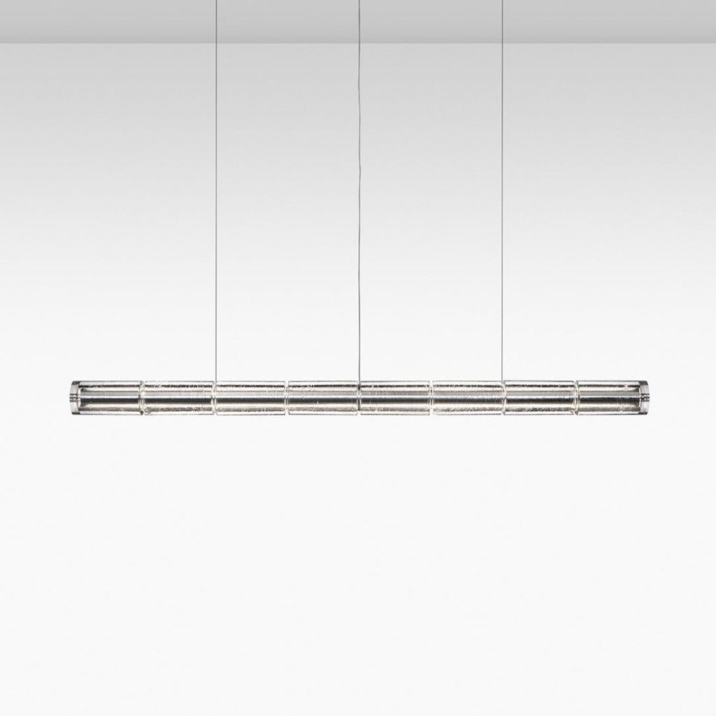 Although suitable for residential and commercial projects, it creates a remarkable artisanal quality, with craftsmanship evident in its intricate details. The glass cylinders are meticulously formed by pouring glass into a mold, with the glass maker's movements imprinting unique markings on each piece.