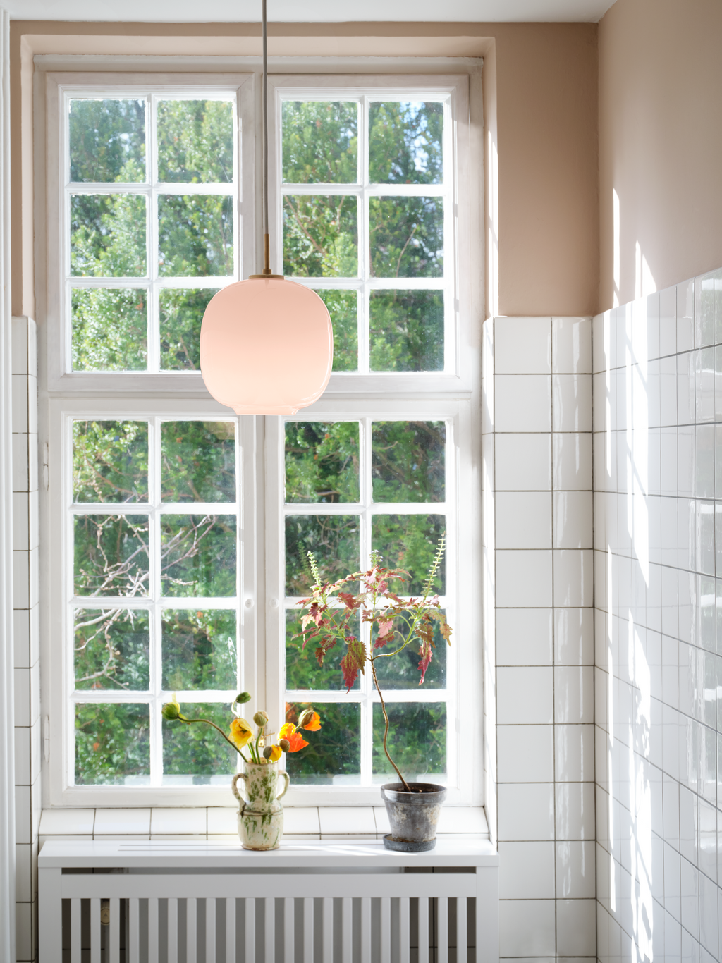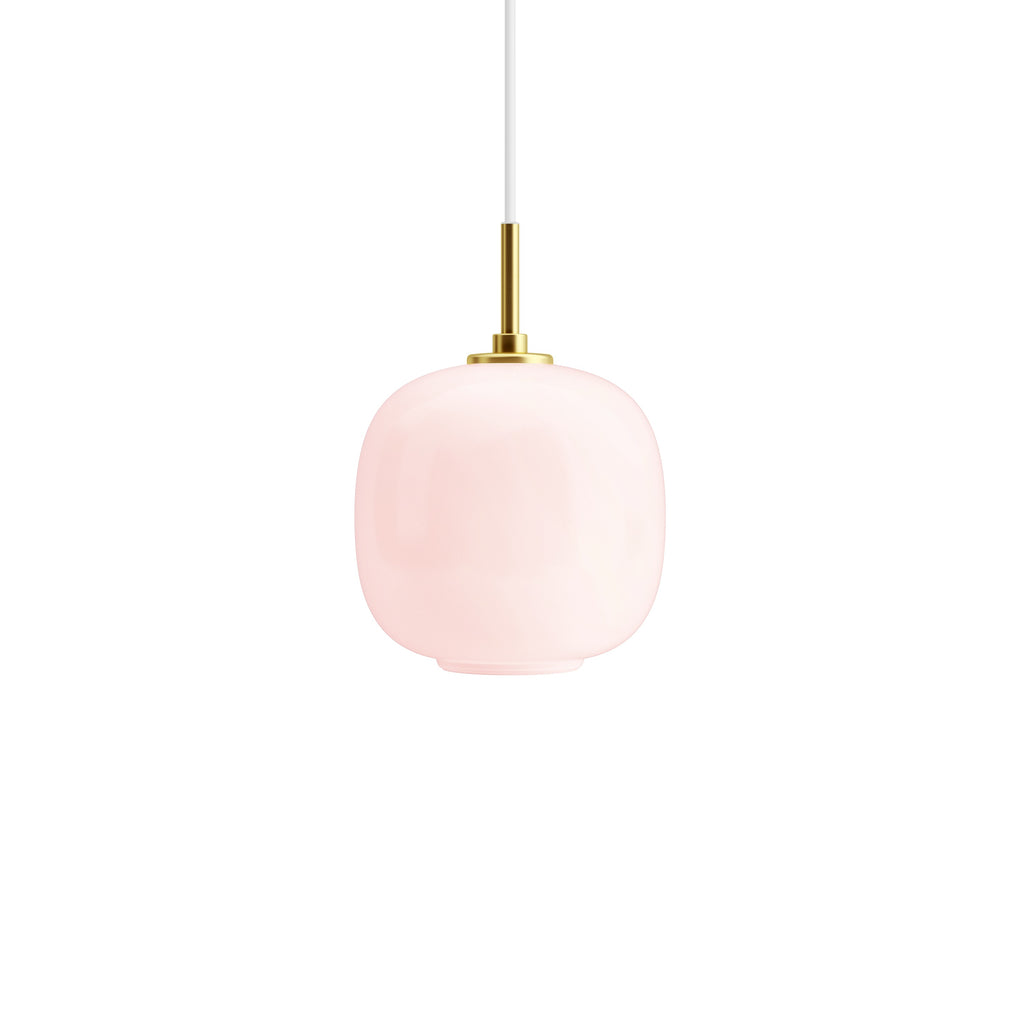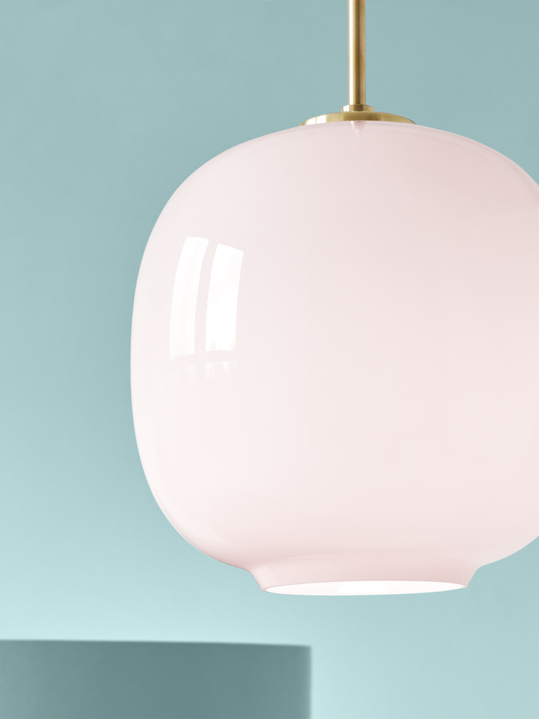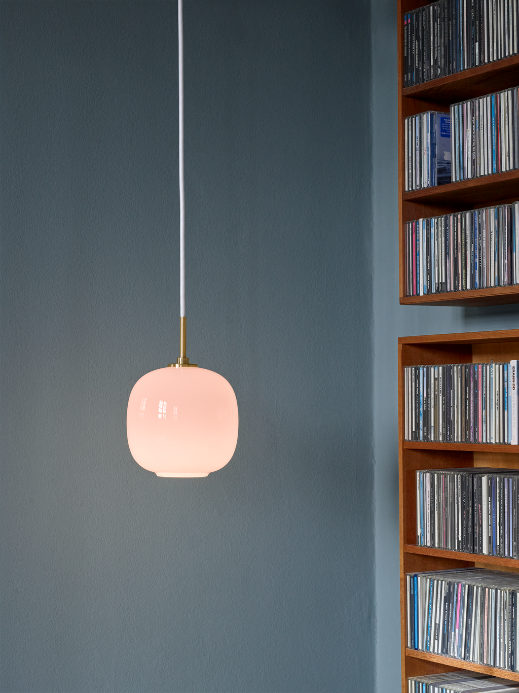 In 2016 the Radiohus Pendant made a comeback under the name of VL45 Radiohus Pendant. It was originally designed in the 1940s by Danish architect Vilhelm Lauritzen in partnership with Louis Poulsen for the construction of the Radiohuset building (the Danish broadcasting house) in Copenhagen. The pendant features the original design, with a brass suspension as well as a shade of three layers of handblown glass. The innermost and outermost layers are made of transparent polished glass, while white or pink glass is used for the intermediate layer. In 2019, the two existing sizes were complemented with a smaller size, to open up the possibilities for an even wider variety of usage and arrangements.