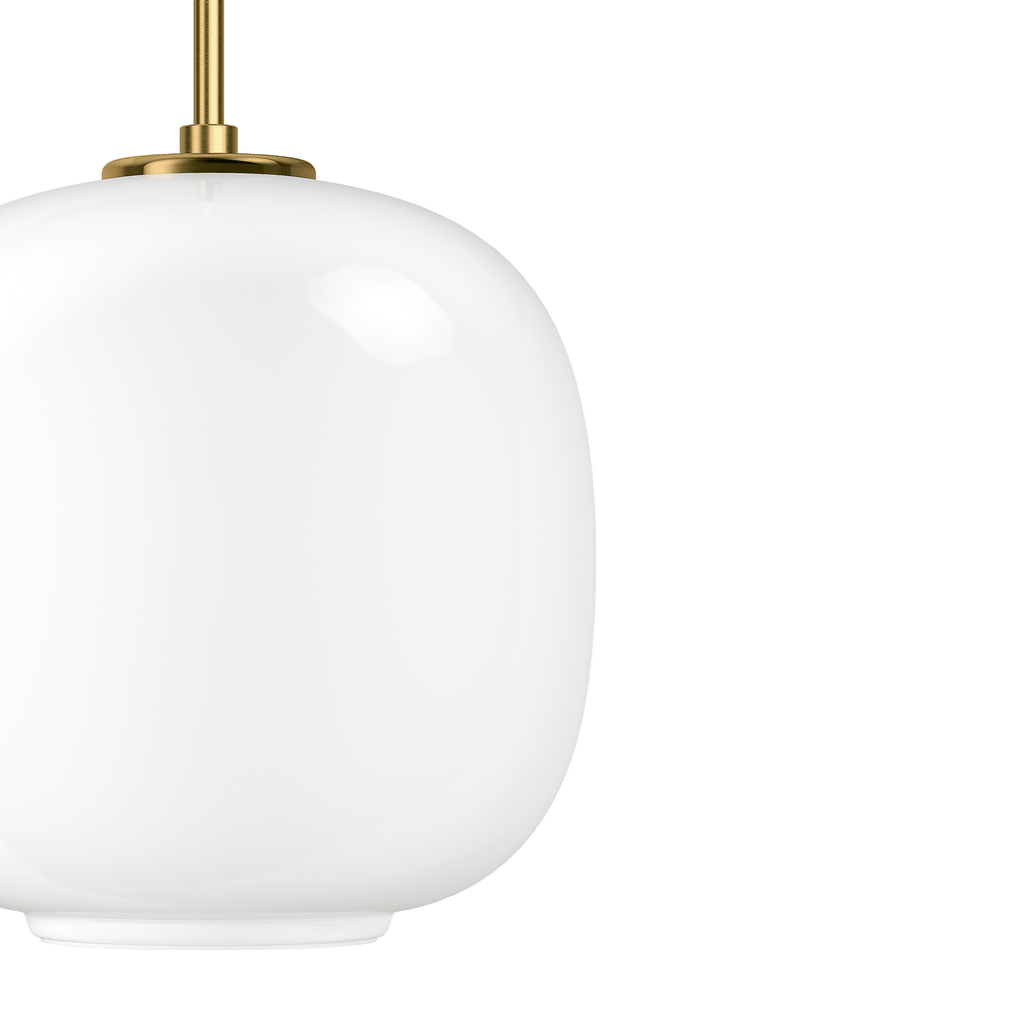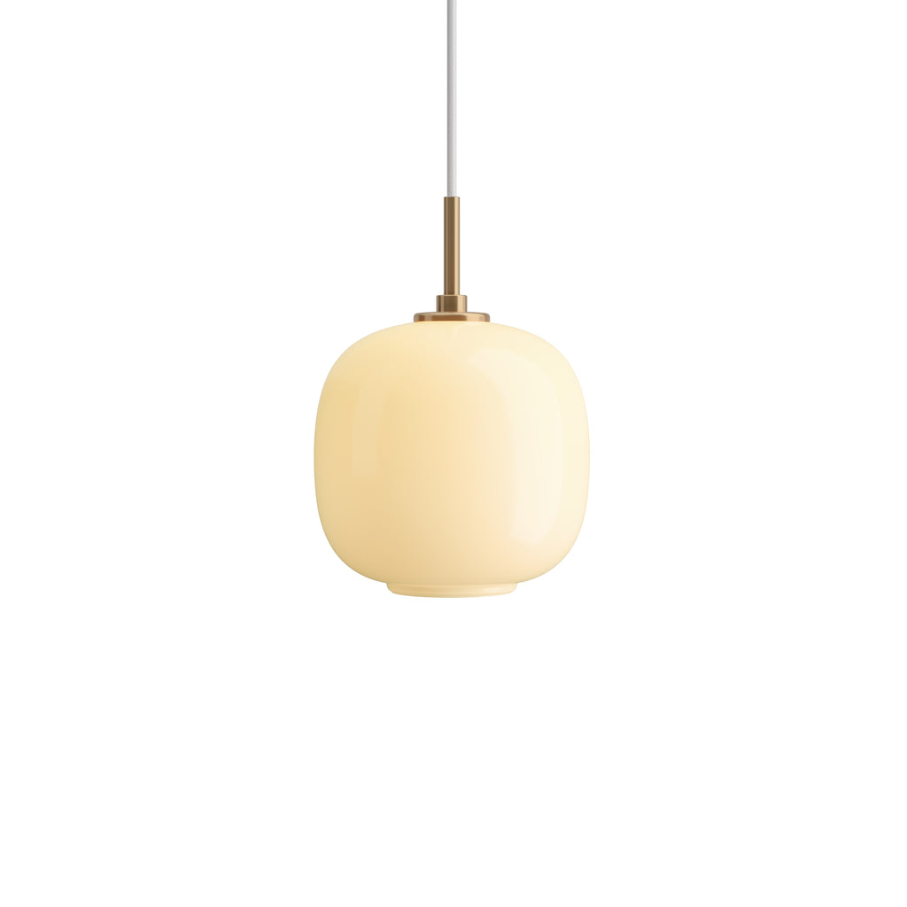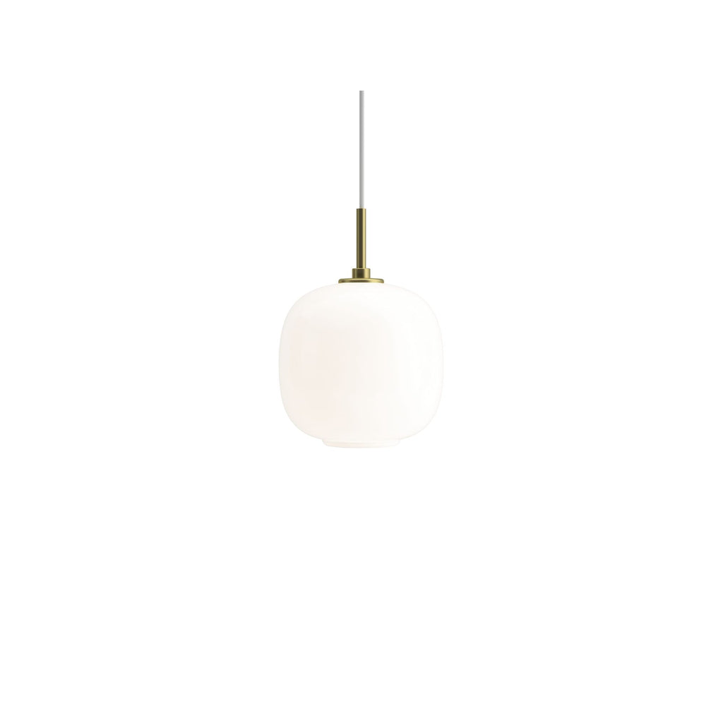 Shade: Hand blown polished opal glass. Pendant fitting: Untreated brushed brass, will patina.