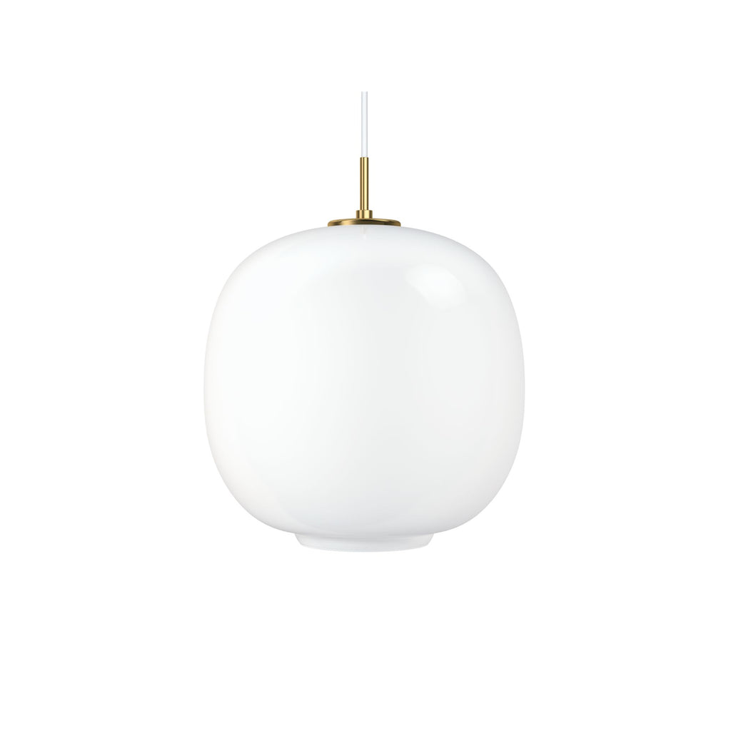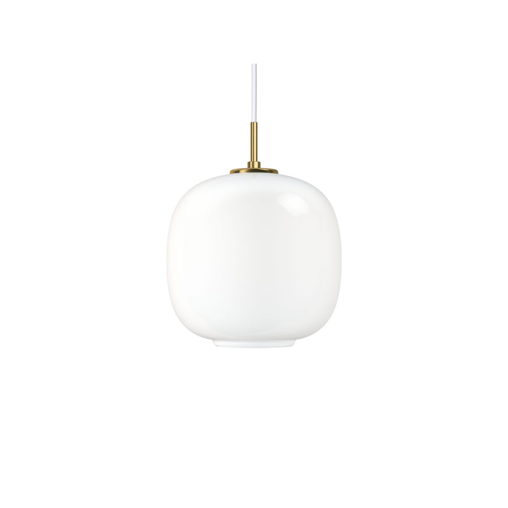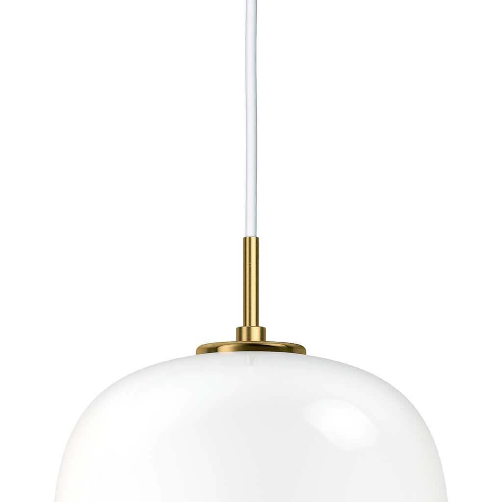 Shade: Hand blown polished opal glass. Pendant fitting: Untreated brushed brass, will patina.