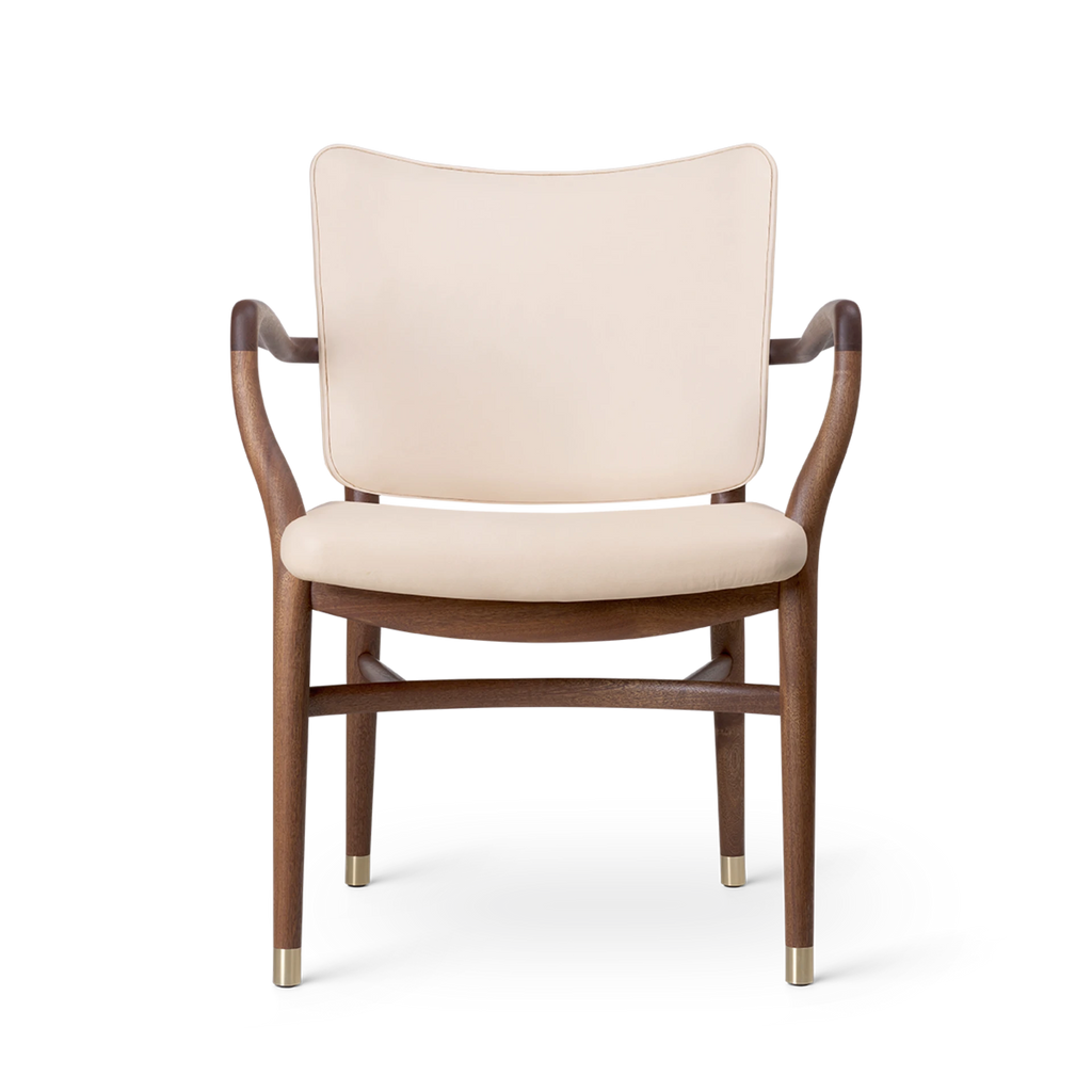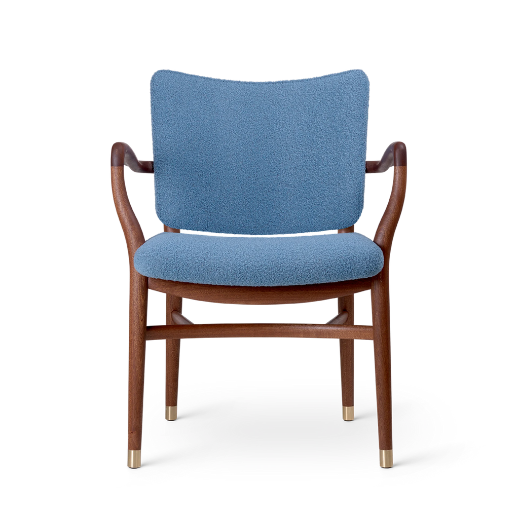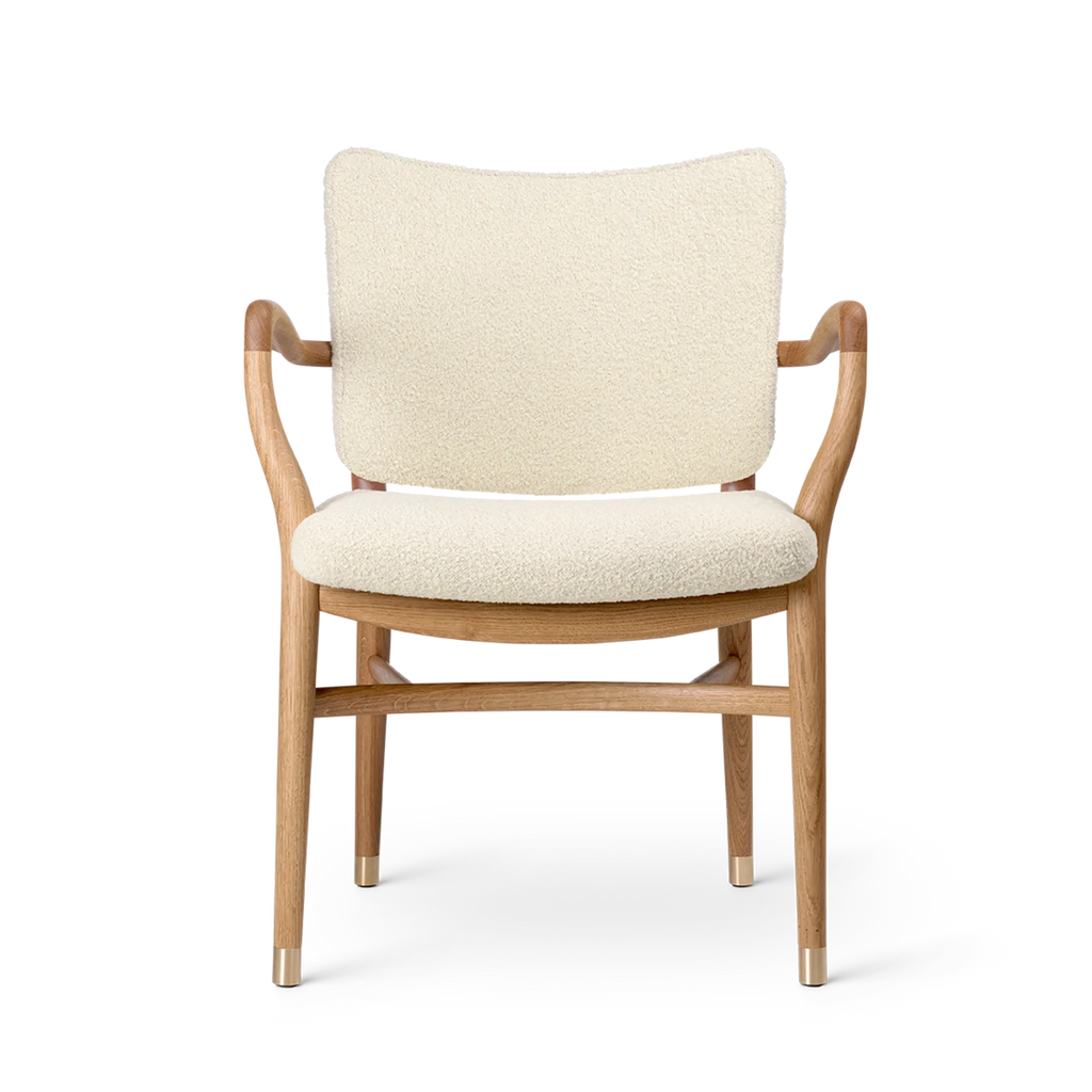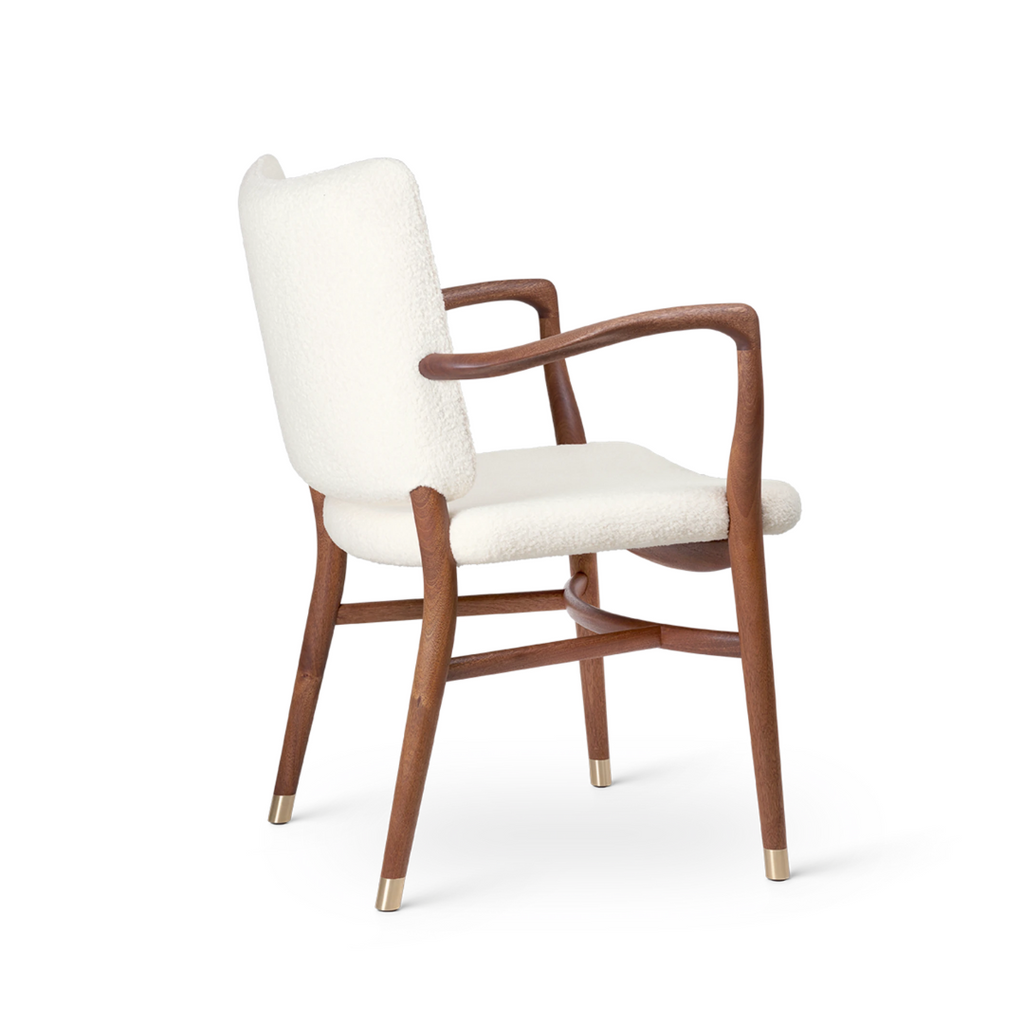 With its generous upholstery, curved armrests and organic, teardrop-shaped curvatures of the bars, the chair embodies an artistic expression that is light and sumptuous at the same time. Details such as the small brass feet and hand-polished joints testify to Vilhelm Lauritzen consistent design signature. Manufacturing the VLA61 Monarch Chair is a complex and time-consuming process for the experienced cabinetmakers at Carl Hansen & Søn, as many of the chair’s parts are curved and double-curved. In addition, all the parts are polished by hand before being assembled, after which the entire chair – especially around the joints – is hand-polished once again to achieve a perfect finish. The backrest is only upholstered after it has been mounted on the chair to achieve precise finishes around the armrests and hind legs – a task requiring the greatest care from Carl Hansen & Søn’s skilled furniture upholsterers.