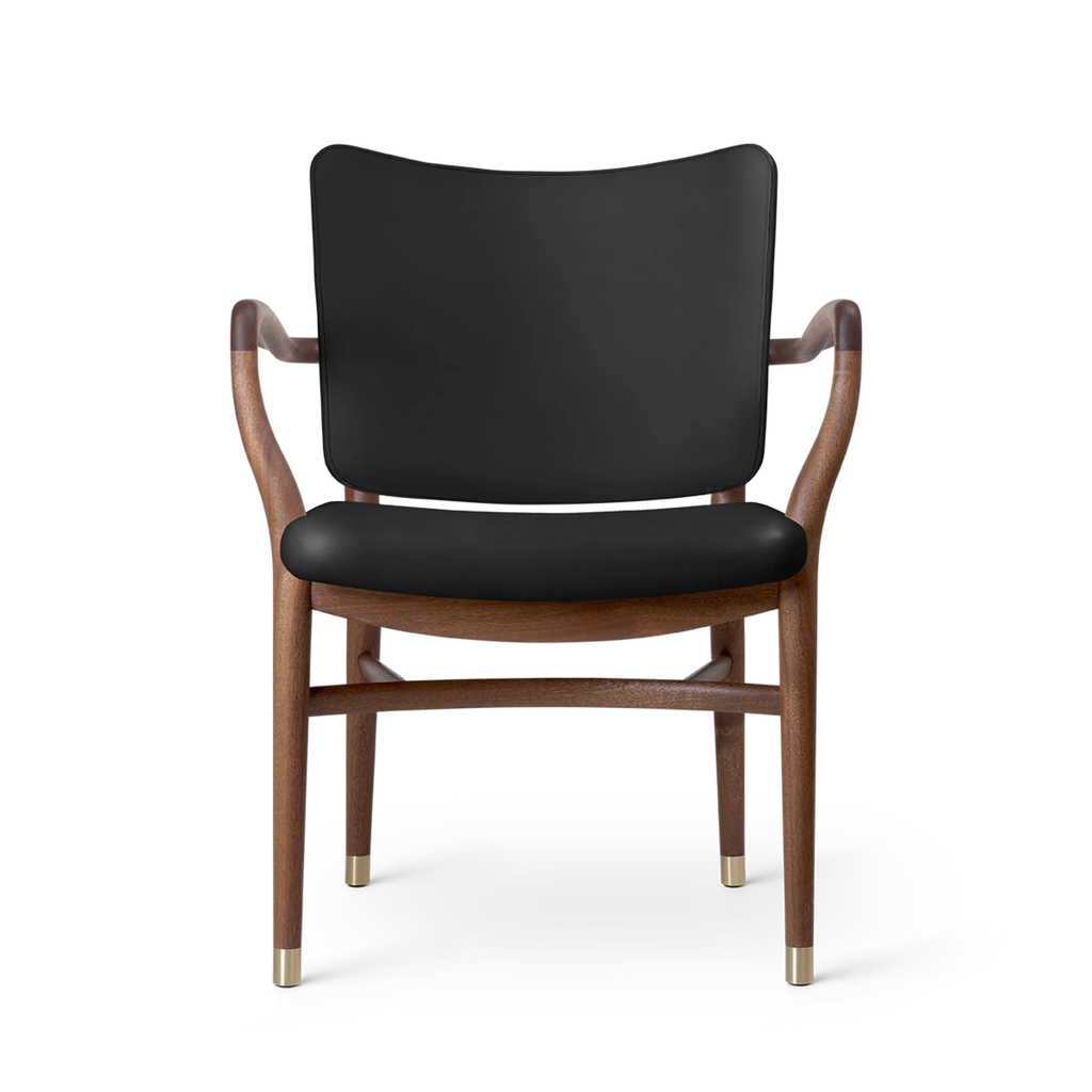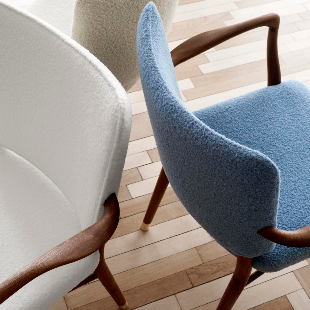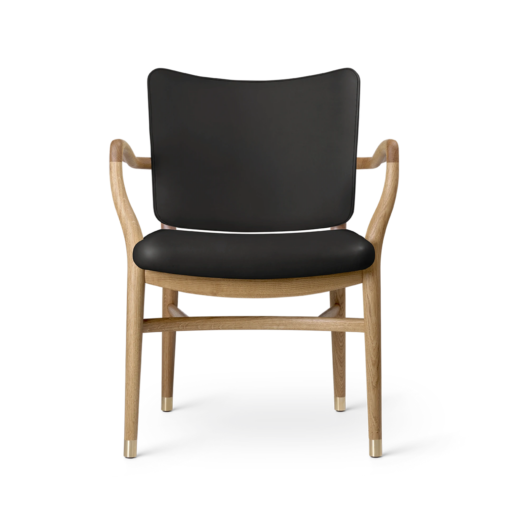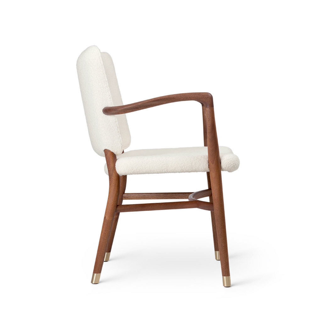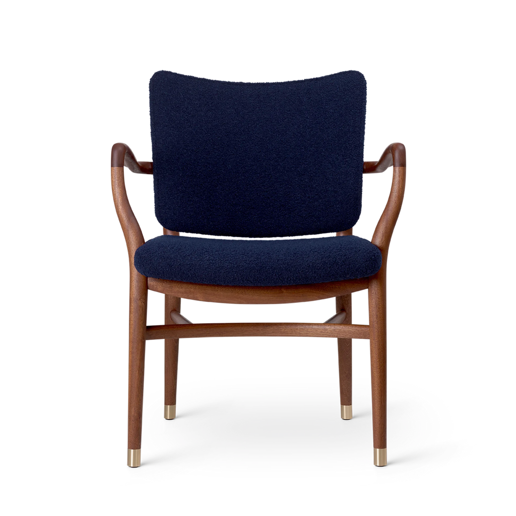 With its generous upholstery, curved armrests and organic, teardrop-shaped curvatures of the bars, the chair embodies an artistic expression that is light and sumptuous at the same time. Details such as the small brass feet and hand-polished joints testify to Vilhelm Lauritzen consistent design signature. Manufacturing the VLA61 Monarch Chair is a complex and time-consuming process for the experienced cabinetmakers at Carl Hansen & Søn, as many of the chair’s parts are curved and double-curved. In addition, all the parts are polished by hand before being assembled, after which the entire chair – especially around the joints – is hand-polished once again to achieve a perfect finish. The backrest is only upholstered after it has been mounted on the chair to achieve precise finishes around the armrests and hind legs – a task requiring the greatest care from Carl Hansen & Søn’s skilled furniture upholsterers.