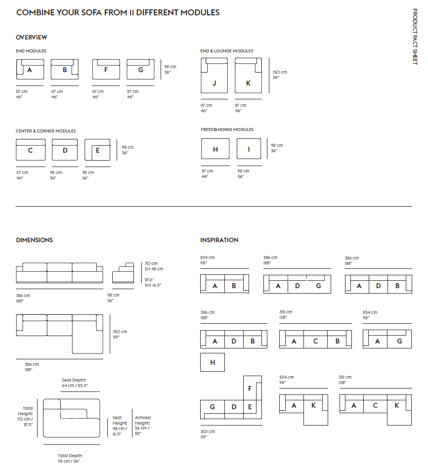 Seat and back frame made in FSC™️-certified (FSC-C028824) wood. Back frame is covered with cold-foam filing and wadding. Seat is made with Nozag springs, felt, cold-foam and wadding. The module is upholstered in high quality textiles with a thin lining of wadding underneath. Modules are kept together with connecting metal brackets.