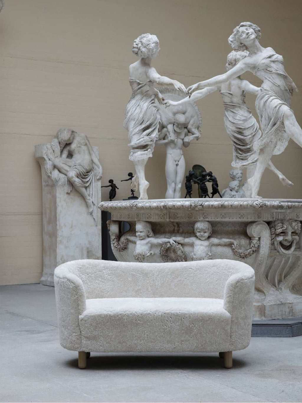 The Mingle sofa was designed in 1935 by architect Flemming Lassen (1902-1984) and was presented at The Copenhagen Cabinetmakers’ Guild Competition in the same year. It was subsequently praised for its qualities as a small but elegant sofa in the professional journal “The Architect”. Flemming Lassen loved to travel, and he was often inspired by his journeys throughout Europe. He was very taken with both Italy and France, and had a burning desire to tour those countries on his motorcycle. Flemming Lassen wanted to create a sofa made for conversation with a comfort that invited people to stay seated and talk together for long periods of time. The armrests were designed to encircle the sitters, generating intimacy and transforming the sofa into a cosy place to relax. Flemming Lassen took inspiration from both French elegance and modern Italian style, and transferred the trends and his own ideas to a small, upholstered sofa called Mingle.