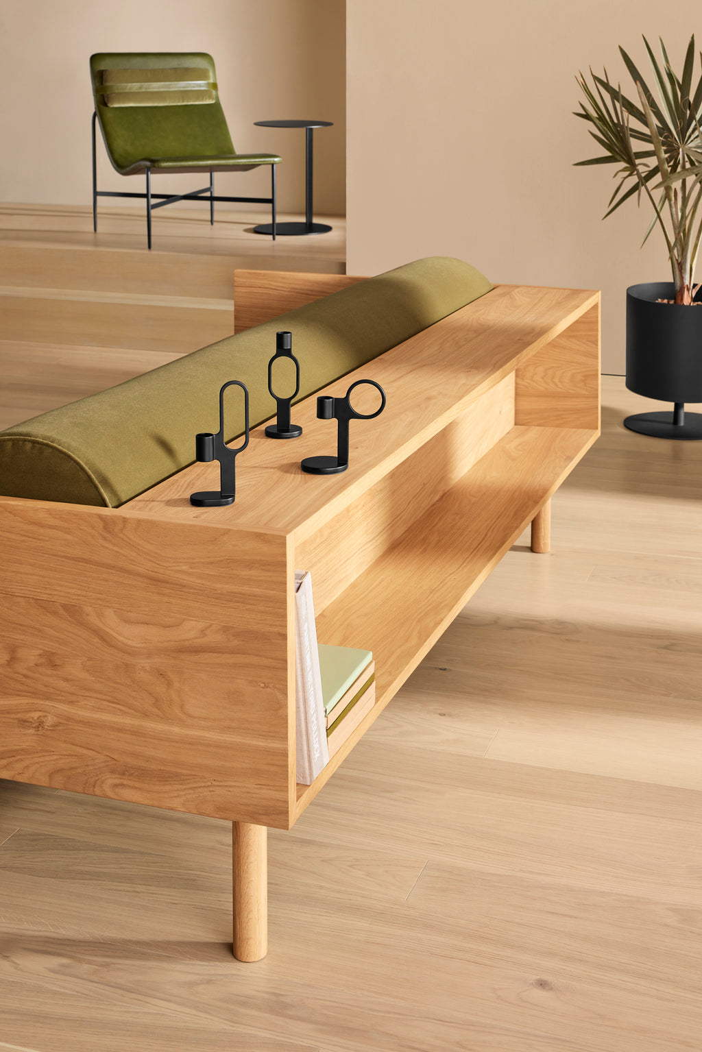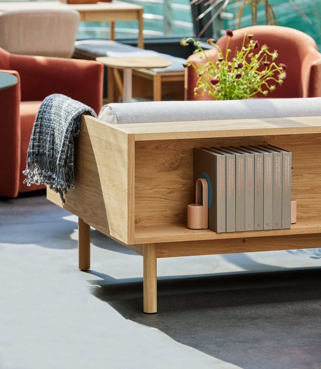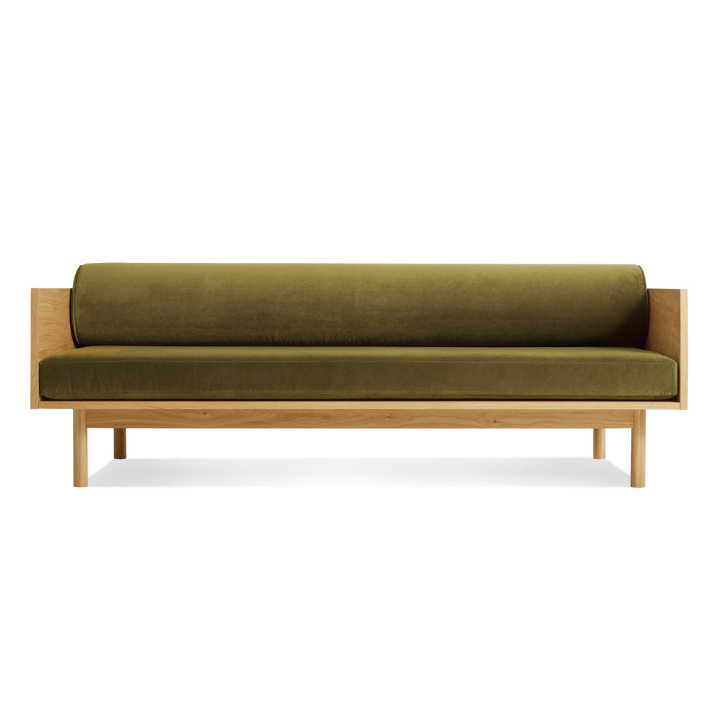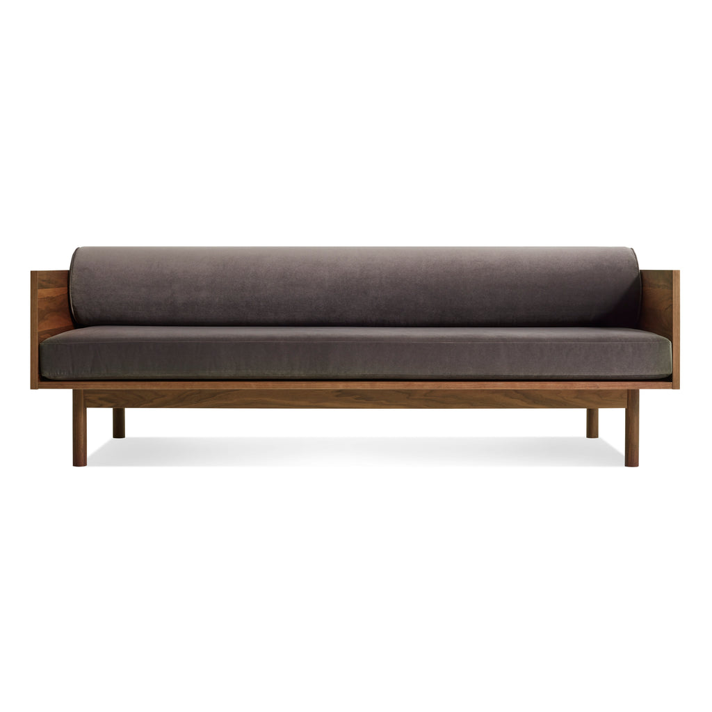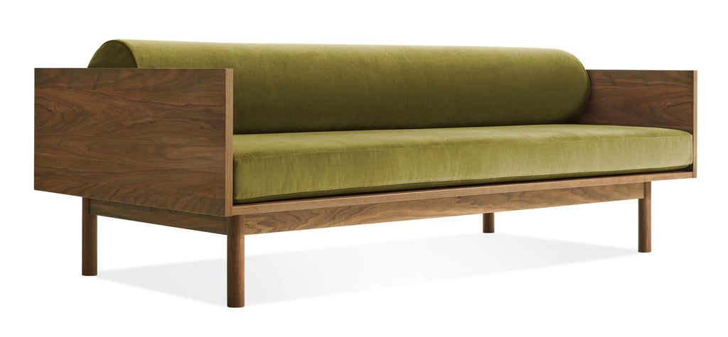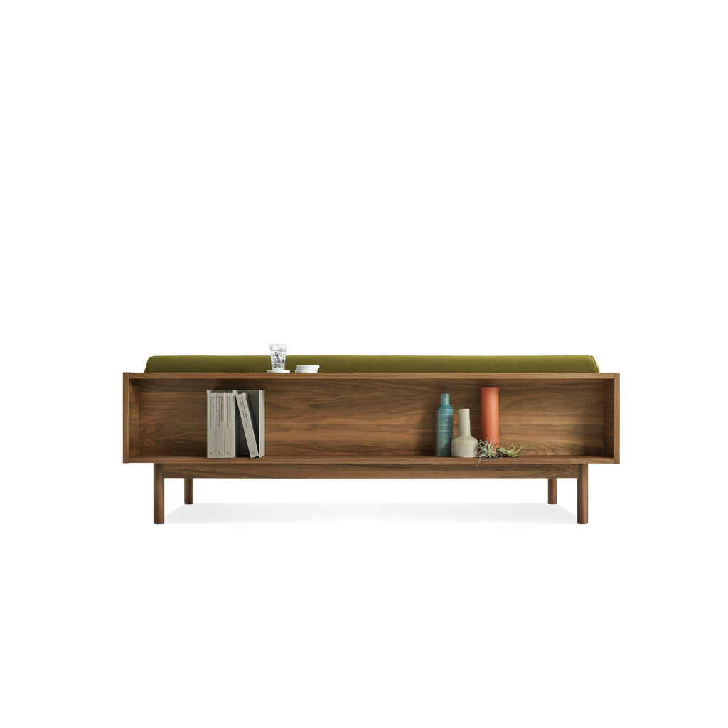 Sofa and bookshelf come together to create an artful display of form and function. Solid wood makes for a dazzling surround while serving as a chic spot to show off your ephemera or rest your martini. A genteel bolster provides ample support and a pleasing vintage vibe without the online auction.
