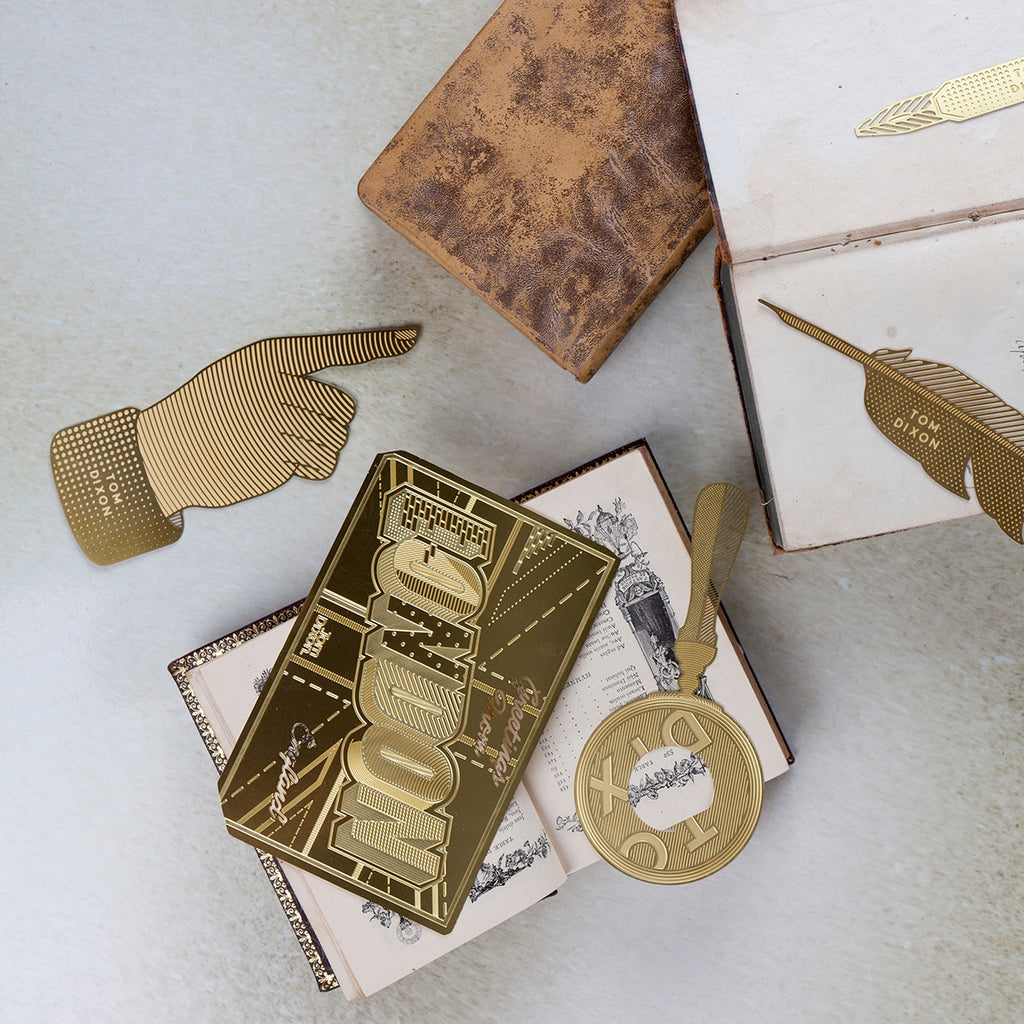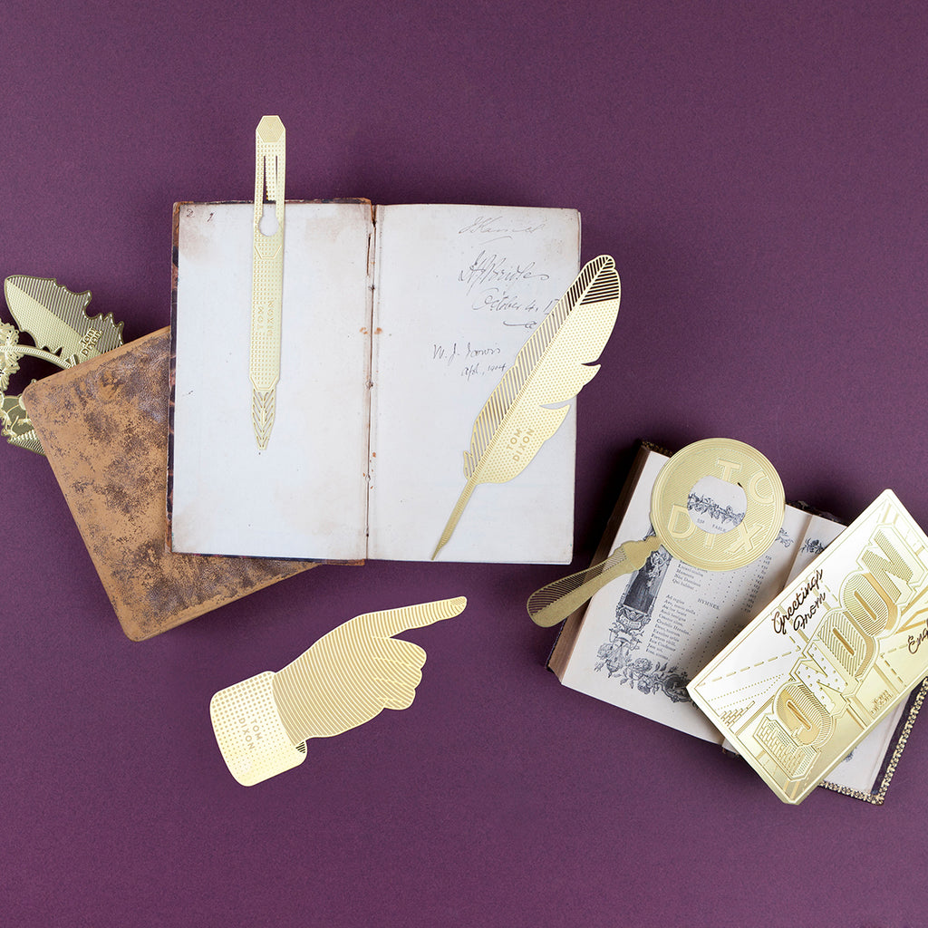 An essential for any bookworm; a solid metal bookmark for marking your place in a favourite read. Formed from etched sheet brass and available in curious shapes including a Quill, Hand and Magnifying Glass. Intricate design detail and our logo are digitally etched onto the surface of every piece.