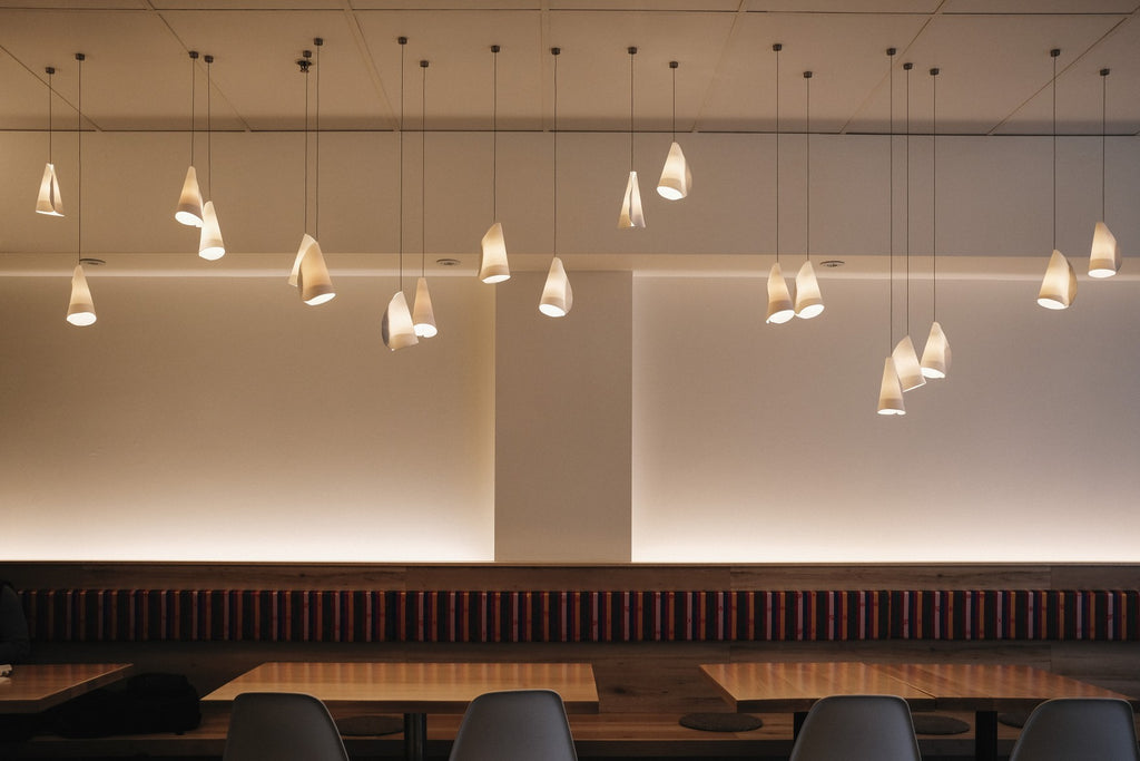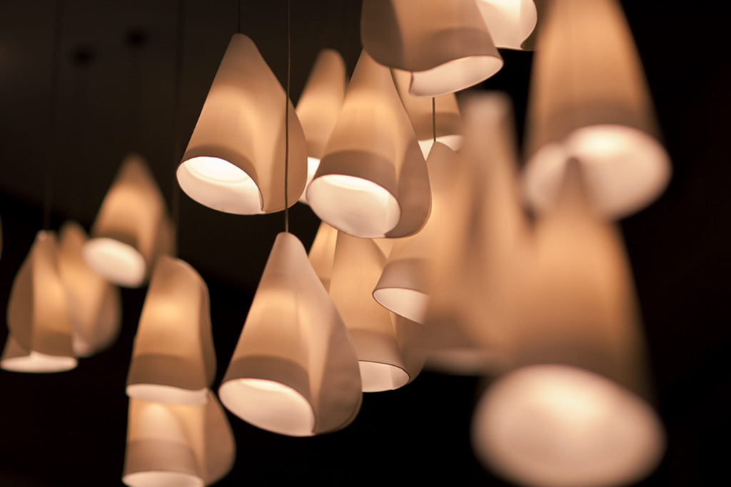 21 results from a fabrication process in which thin porcelain sheets are draped over an inverted diffuser made of sandblasted borosilicate glass. The thin porcelain skin is allowed to dress the borosilicate core in whatever form occurs naturally – creating a unique shape in every iteration of the fabrication process.