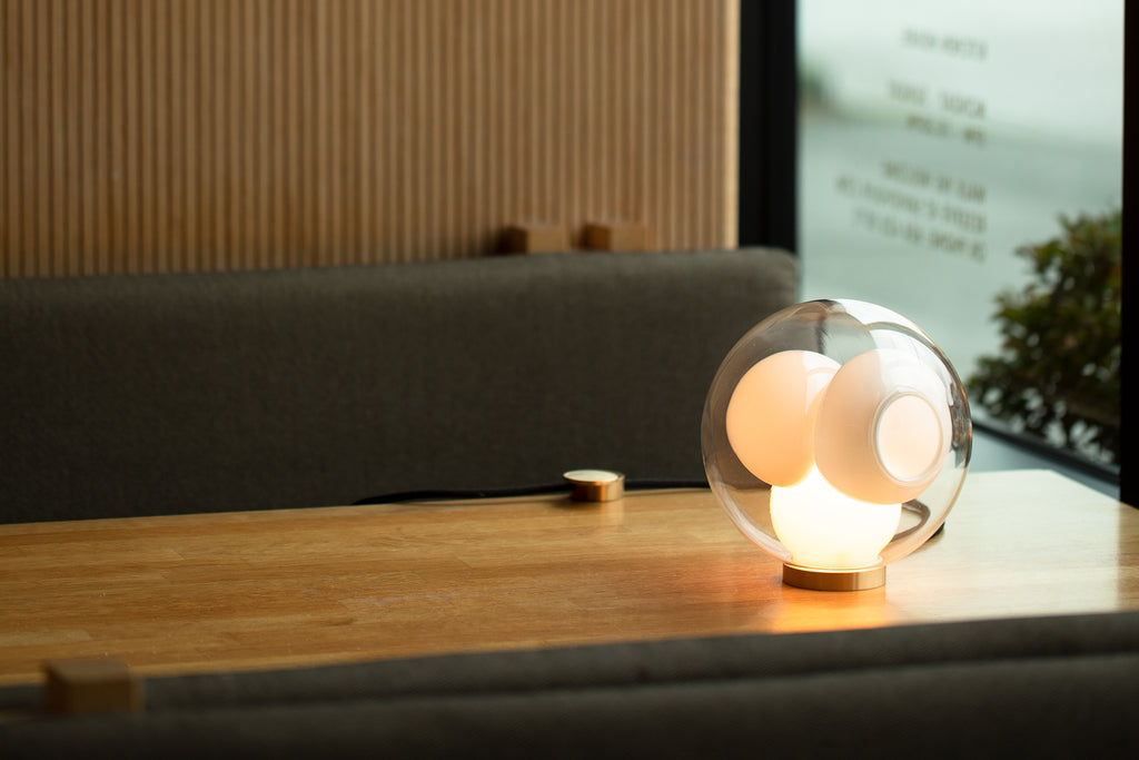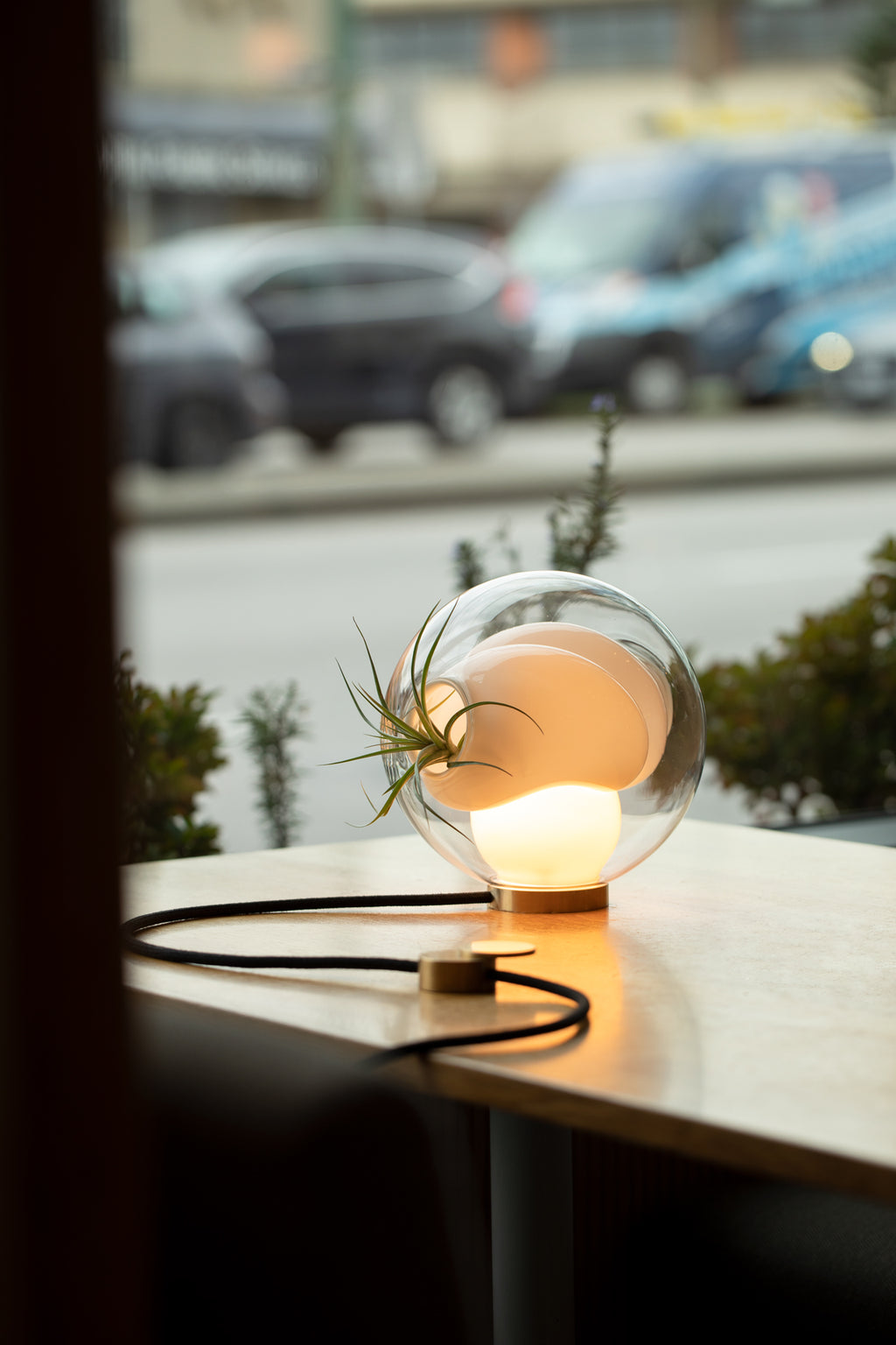 38V series pendants can be used with the table light hardware, which includes an integral dimming system housed within a sleek brass cylinder. The black fabric cord is semi-rigid and may be sculpted to add form. The brass stand has a small notch on the underside, allowing it to be hung on a wall if desired.