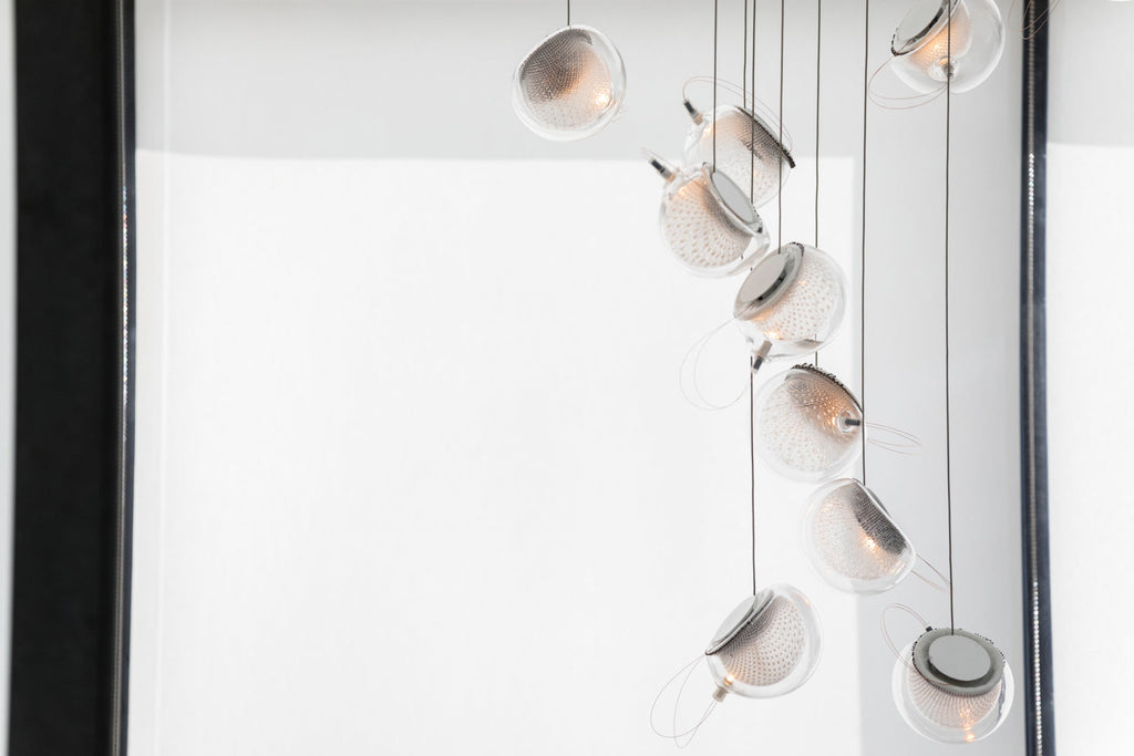 76.5 is comprised of 5 pendant made from blown glass, each housing a 0.4 watt LED lamp, and comes with 5x 10ft of coax cable. Longer cables available at additional cost. Please contact us if this is required.