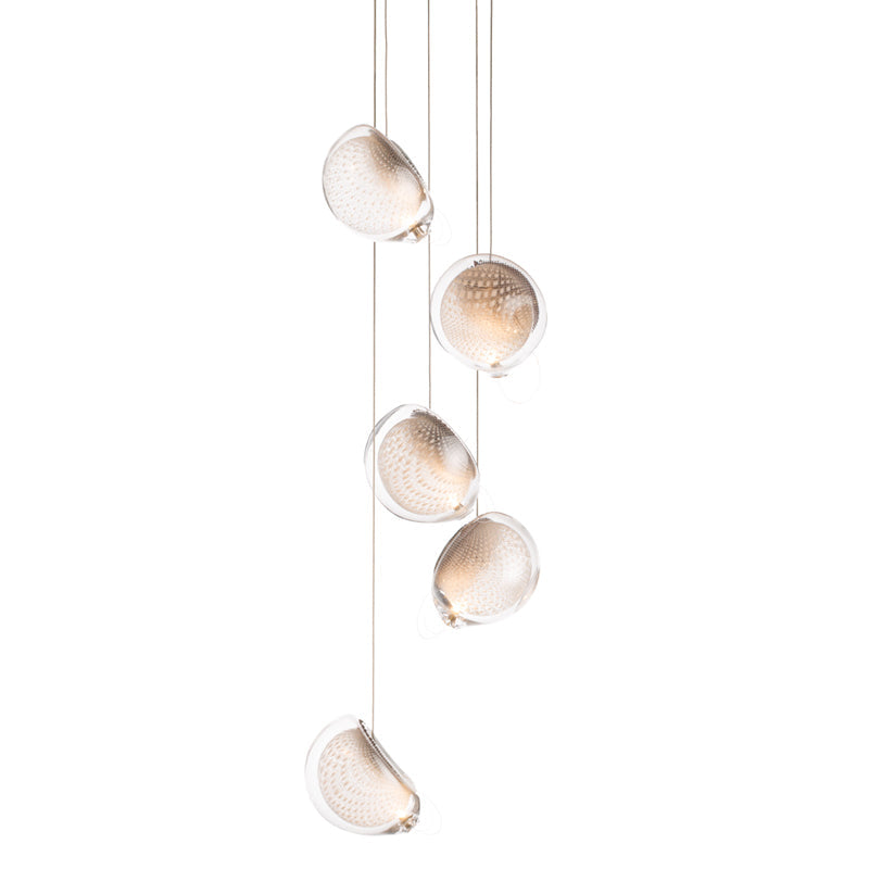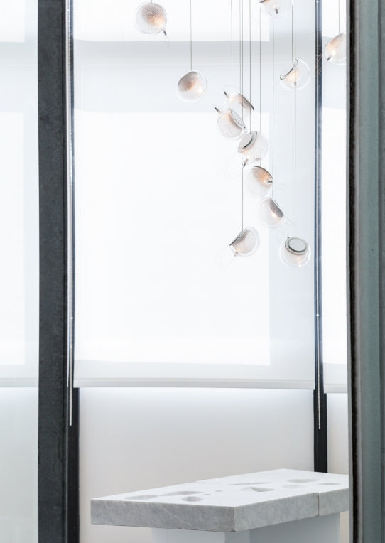 76.7 is comprised of 7 pendant made from blown glass, each housing a 0.4 watt LED lamp, and comes with 7x 10ft of coax cable. Longer cables available at additional cost. Please contact us if this is required.