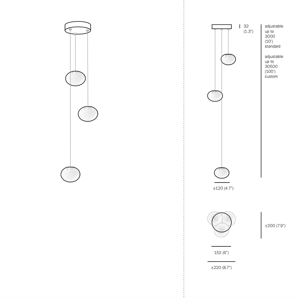 84.3 is comprised of 3 pendants and comes with a white powder coated canopy and 3x 10ft coax cable.