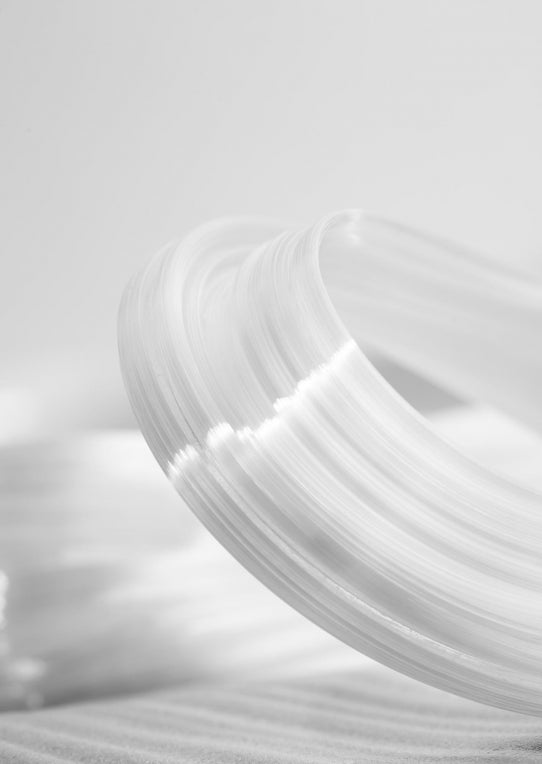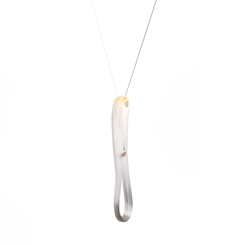 Soda water is used to trap air in a super heated glass matrix, which is vertically stretched and folded back onto itself between pegs numerous times. As the glass cools, the folding motion along the grain of the loop turns the entrapped air into microfilaments that give the piece a pearlescent optical quality. A low-voltage xenon or LED light source is introduced at one end of the loop casting light through the microfilaments and registering a gentle gradient.
