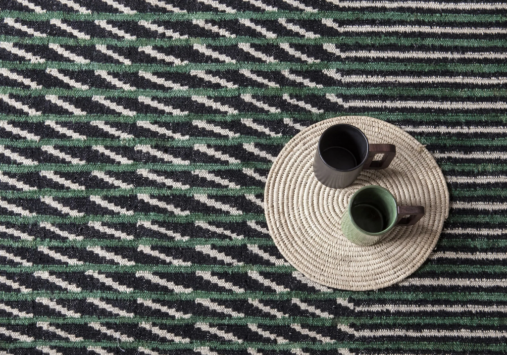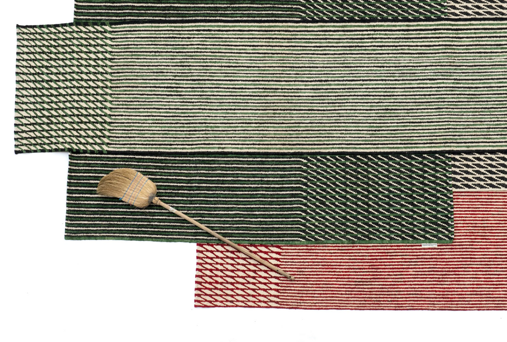 This blurred effect has been achieved by inverting the sense in which the kilims are traditionally woven, which makes the process much more laborious. This change in weaving causes the lines to be blurred, mixing two colours unevenly, creating an aged rug, reminiscent of the past.