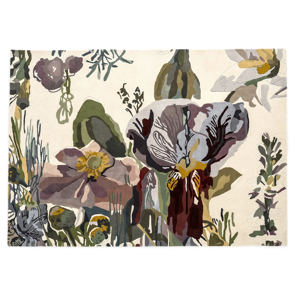 Backyard is a literal representation of one of Moix's works, in which the original piece has been transferred as reliably as possible to a rug. Its name refers to the natural space behind a house, where the flora is wilder. Hence it is a mural with a messier approach where flowers are presented on a spectacular scale. Its lines in low relief reflect the pencil sketches of the painting.