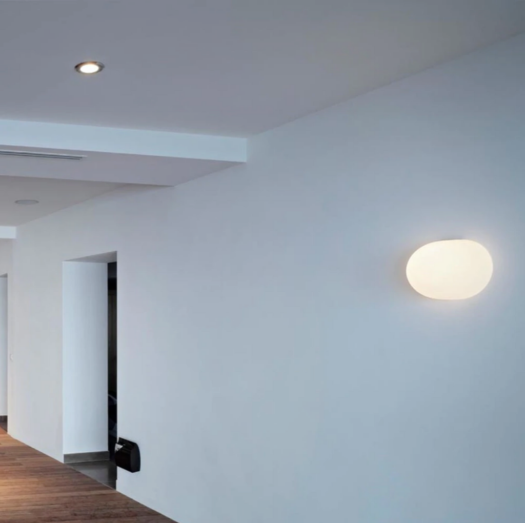 Part of the popular Glo Ball Series, the Glo Ball W wall sconce was created by artist Jasper Morrison. Its shape invokes the radiant calm of a full moon. The Glo Ball W’s diffuser is made of externally acid-etched, hand-blown, flashed opaline glass. It features a metal mounting plate.