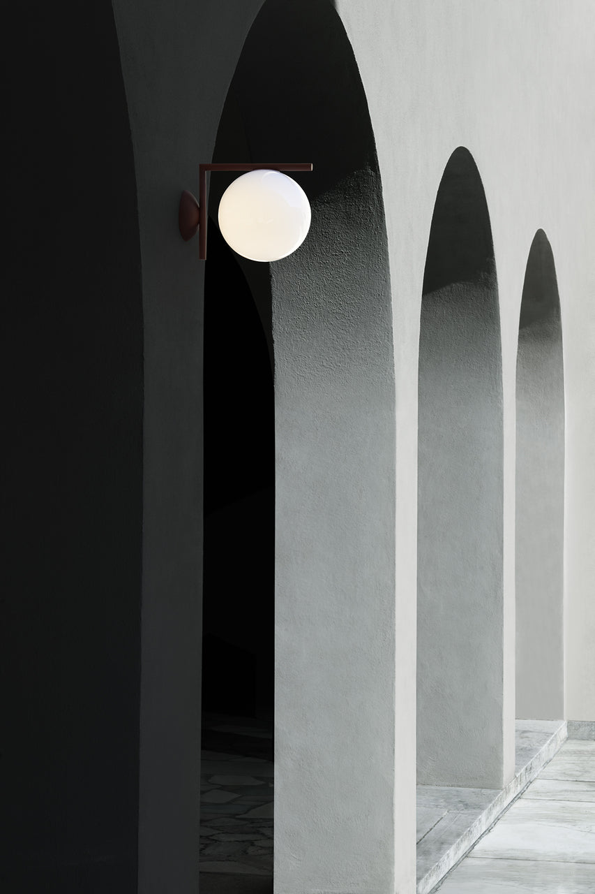 The IC Lights Outdoor collection has expanded to include two sizes of ceiling and wall sconces, CW1 and CW2. Michael Anastassiades’ IC Lights series is a study in balance, now with technological engineering suitable for weathered environments. Frame in brushed stainless steel, brushed brass finish or painted opaque black or burgundy. The structure of the fitting is treated with a chemical conversion process for effective resistance to atmospheric agents. Opalescent diffuser in shiny white translucent blown glass.