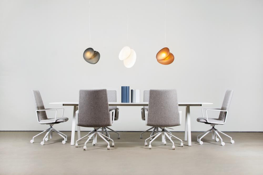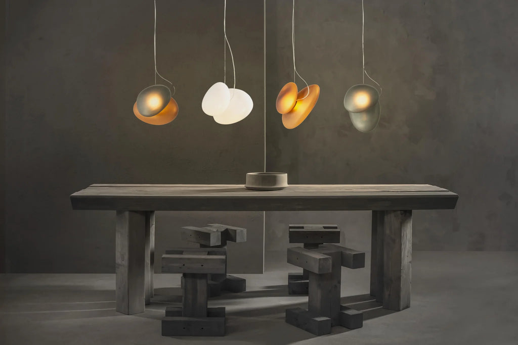The Pebble series celebrates the inexplicable and beautiful qualities of stones. Enhancing their simple yet sculptural form through translucency, two glass blown shapes come together entering a dialogue. The result is a seemingly bespoke pendant fixture—endlessly evolving in shape as it appears from different angles. With the Linear Pendant, a procession of lights elongates the luminaire through the space in which it inhabits, emphasizing range.