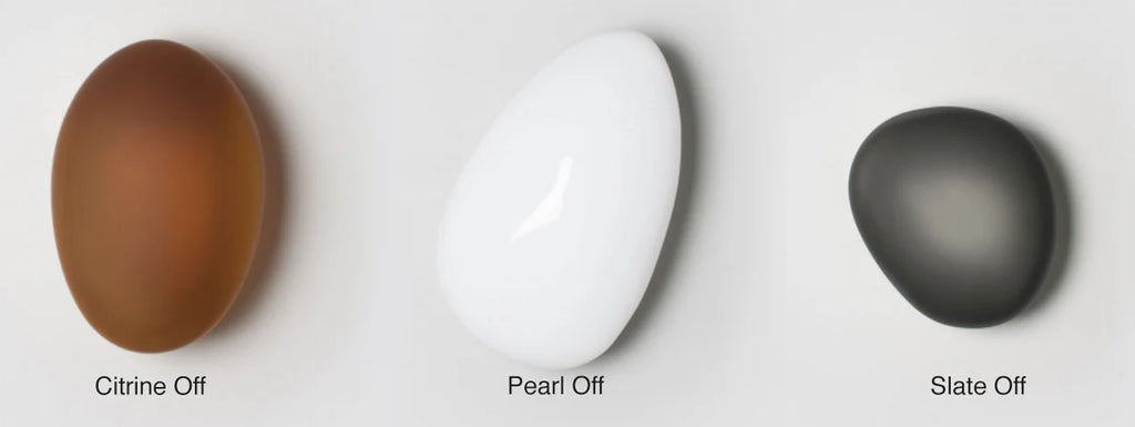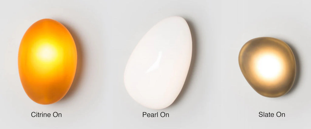 Always a combination of two glass blown forms each with four possibilities for finishes, the pebble allows for the individual to extract their personal collection. MADE IN CANADA.