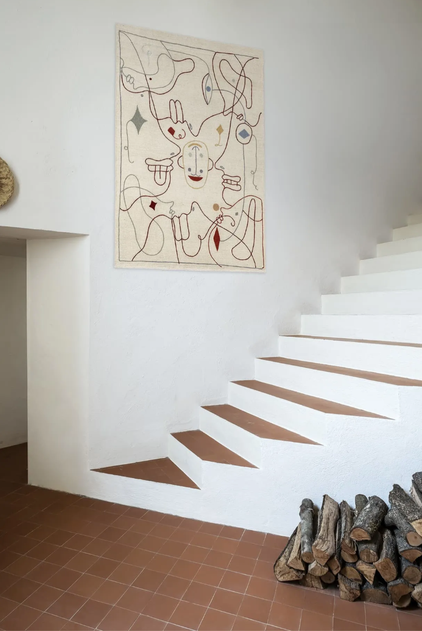 Nanimarquina introduces the embroidery on kilim technique for the first time, a laborious process handmade in Pakistan where the chain stitch embroidery adds texture and a soft volume that emphasizes the sinuousness of the illustration. Despite its delicate appearance, it is a sturdy technique suitable for both residential and commercial use. Available in two standard sizes, as well as a tapestry piece that can be hung vertically.