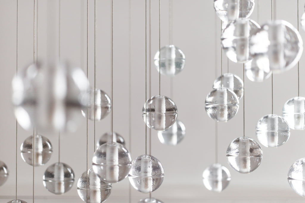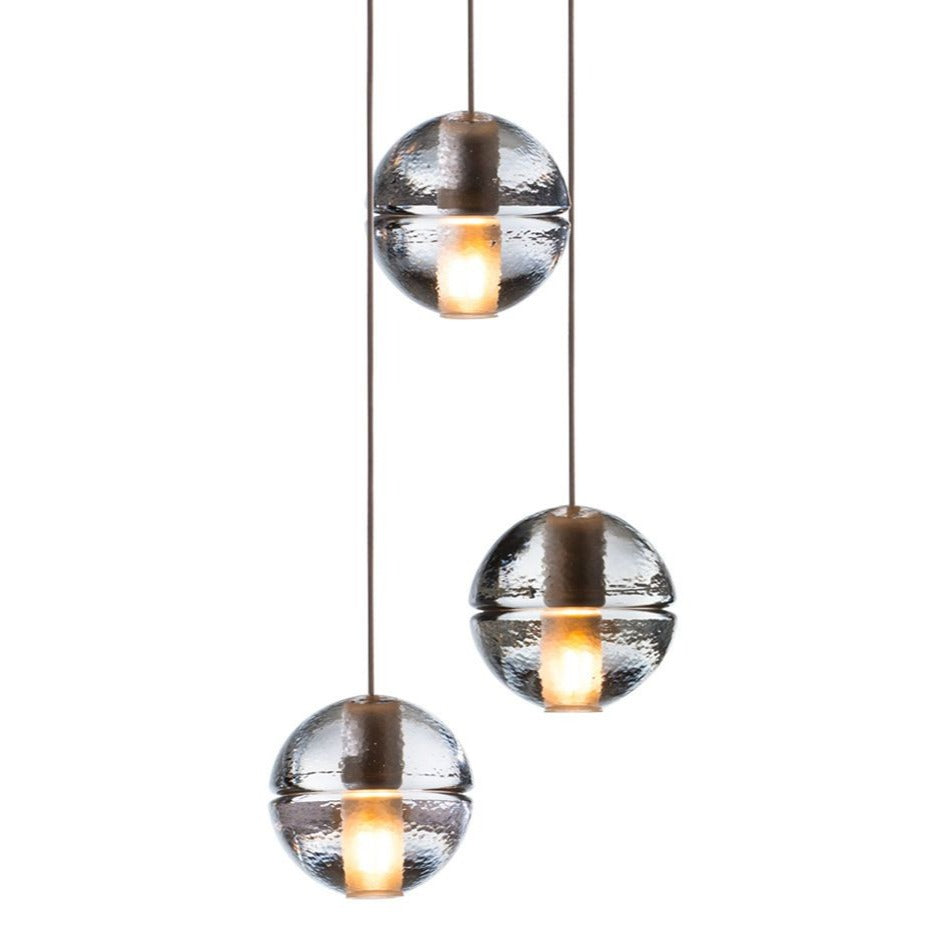 14.3 is comprised of 3 cast glass pendants which attach to a single brushed nickel or white canopy.