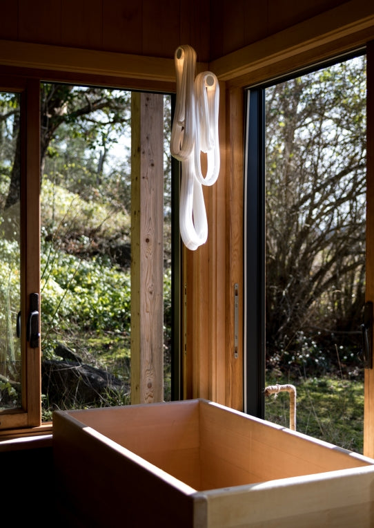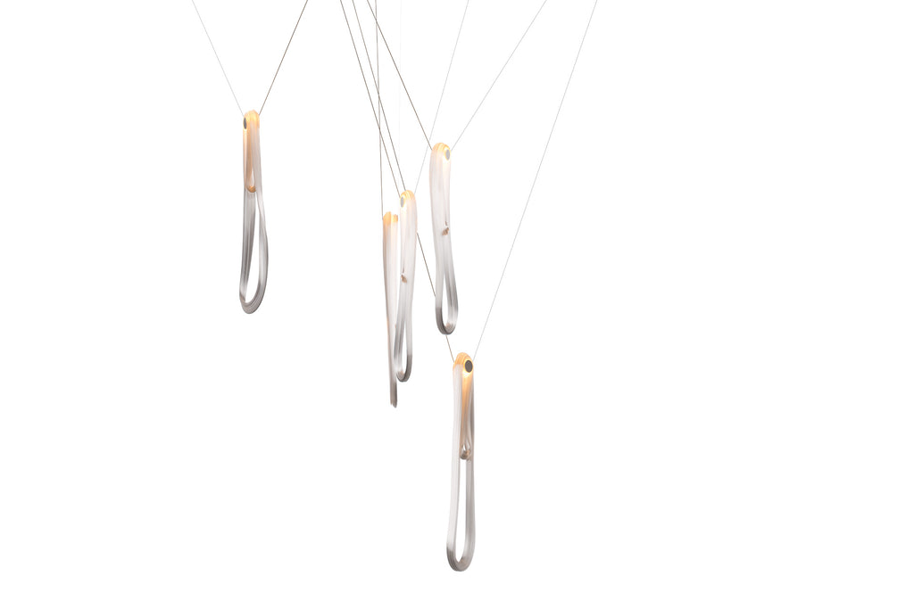 Soda water is used to trap air in a super heated glass matrix, which is vertically stretched and folded back onto itself between pegs numerous times. As the glass cools, the folding motion along the grain of the loop turns the entrapped air into microfilaments that give the piece a pearlescent optical quality. A low-voltage xenon or LED light source is introduced at one end of the loop casting light through the microfilaments and registering a gentle gradient.