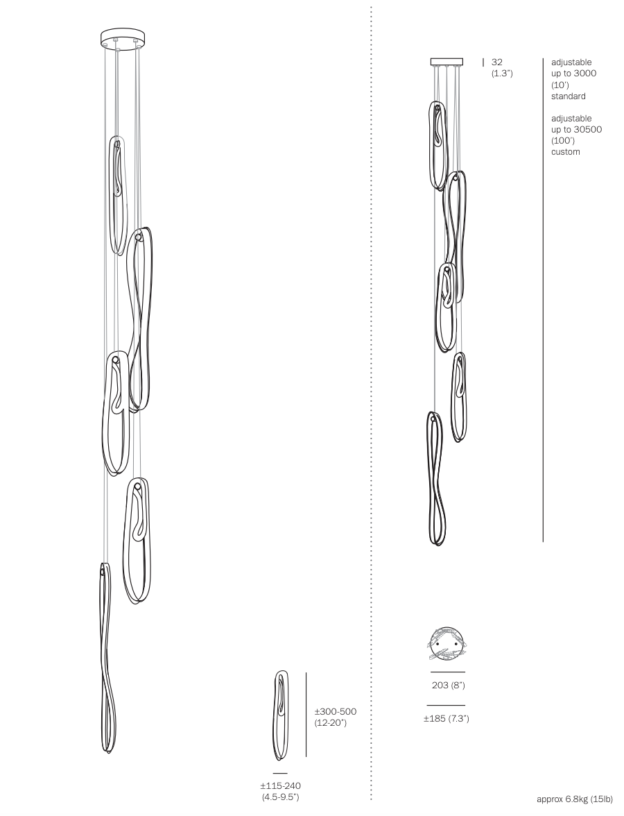 87.5 random is comprised of 5 pendants suspended from a canopy and swag hook. Pendants can be hung from any number of optional swag points mounted on or away from the canopy. Comes with 5x 10ft of coax cable and aircraft cable.